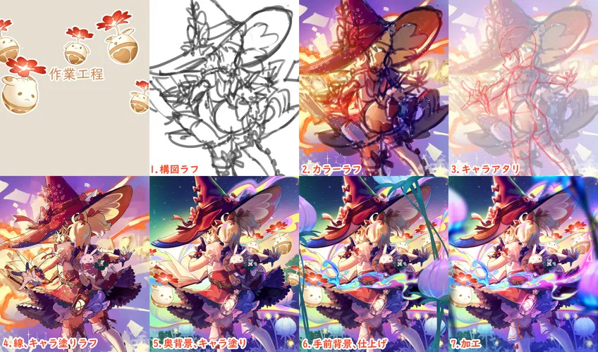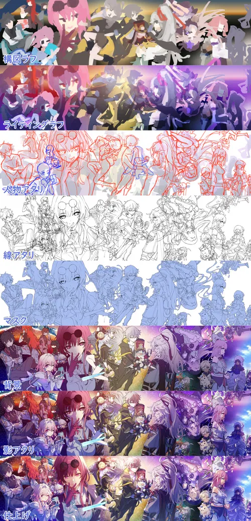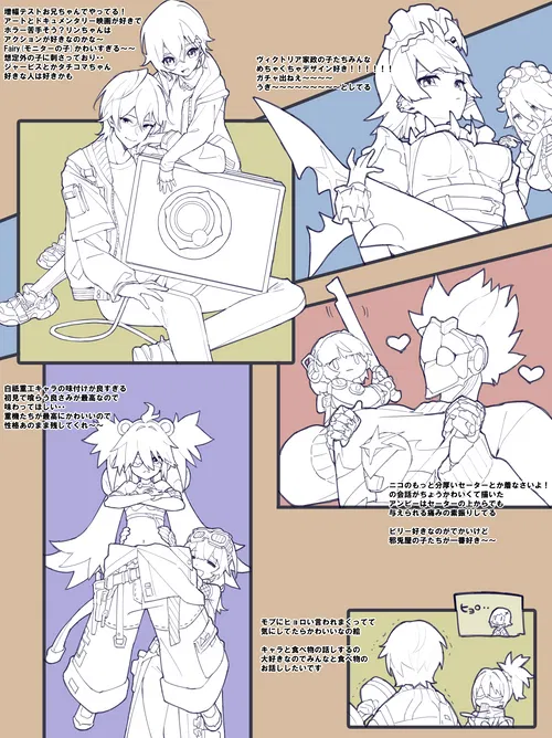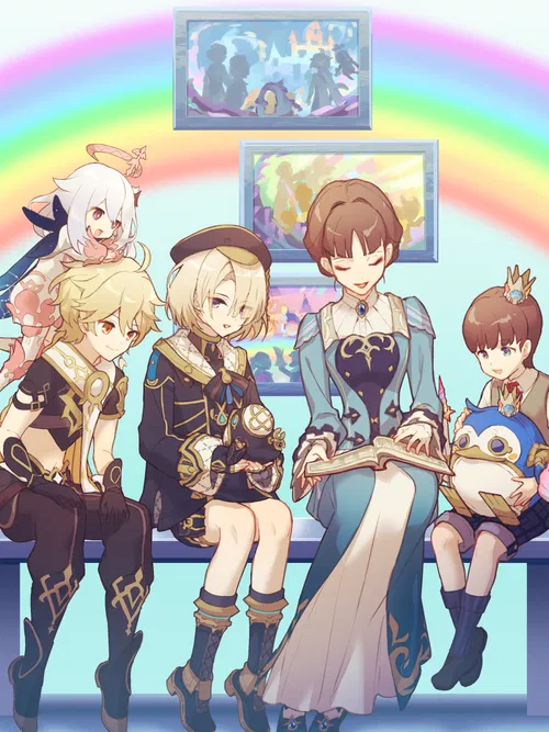 お祝いを空から君に届けます🎈 HoYoFair ”Stories Because of You” にてお祝いで飛ばす気球を設計・デザインしているミカとアルベド、気球に乗せるためのプレゼントのぬいぐるみを作ったり、みんなに書いてもらったお手紙、思い出の写真などを用意しているエウルアとスクロースを描きました! 後ろのシズクちゃんバルーンはクレーちゃんたちからヴェルーリヤミラージュのお話を聞いて、もらった絵や写真を参考にふたりが再現したイメージです。奥のラフの時にいた子たちを追加した差分絵です~ どの作品も音楽まで全部凝っててとっても楽しかったー!3周年おめでとうございます🎈こちらから見れますのでぜひ~