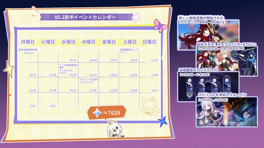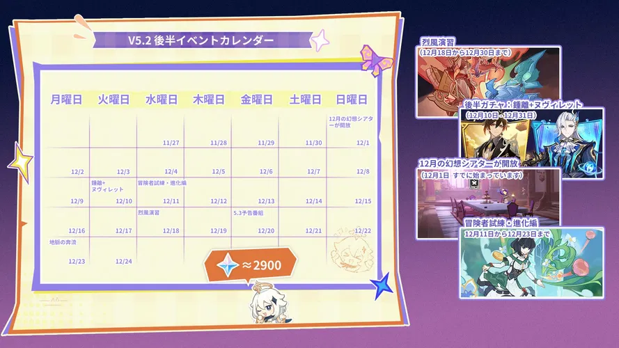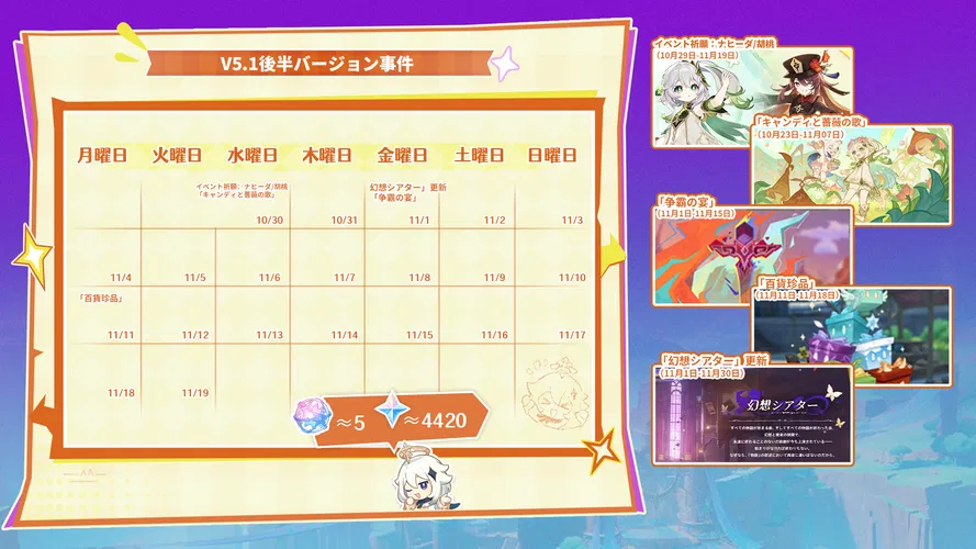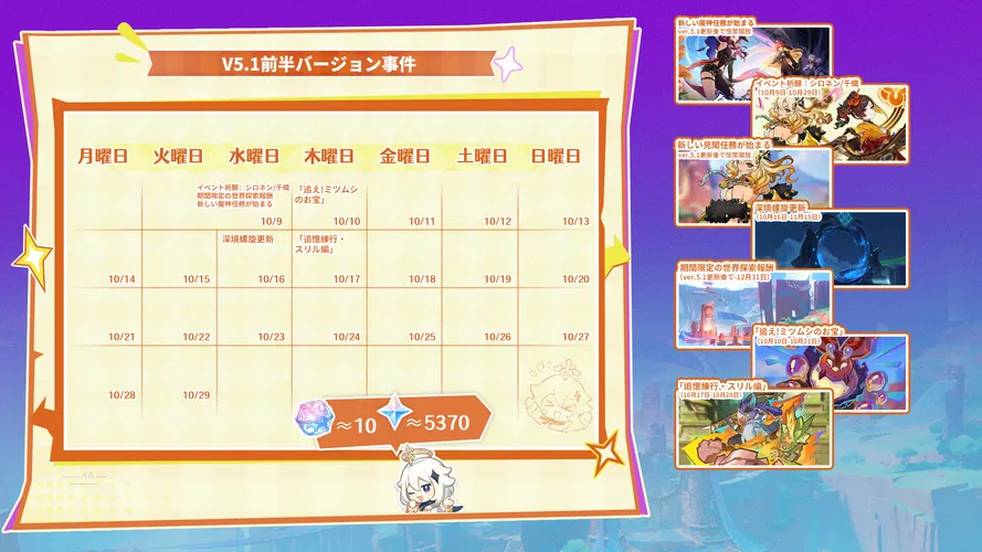序文 Ver.5.1後半のバージョンアップに伴い、旅人たちは新たな内容を体験したいと思いますが、皆さんはイベントの開放時間や星玉入手情報を十分に知っているでしょうか?今回は最も詳細なイベントカレンダーを紹介したいと思います!皆さんがより早くリソースの計画を立てるように!❤ ✦イベントカレンダー✦ まとめ Ver.5.1のイベントボーナスが公式でまだ完全発表されていないため、上記のデータは一部が予測し、発表された際に、速やかに更新します!好きならばコレクションもできますよ~ 役に立つなら幸いです!もし原神に関する最新情報を見逃したくない方は、チャンネル登録お願いします~これからもVer.5.1の詳細な攻略をお届けるので、ぜひ楽しみにしていてくださいね!❤