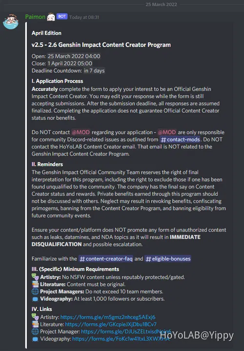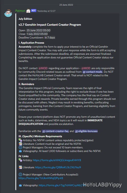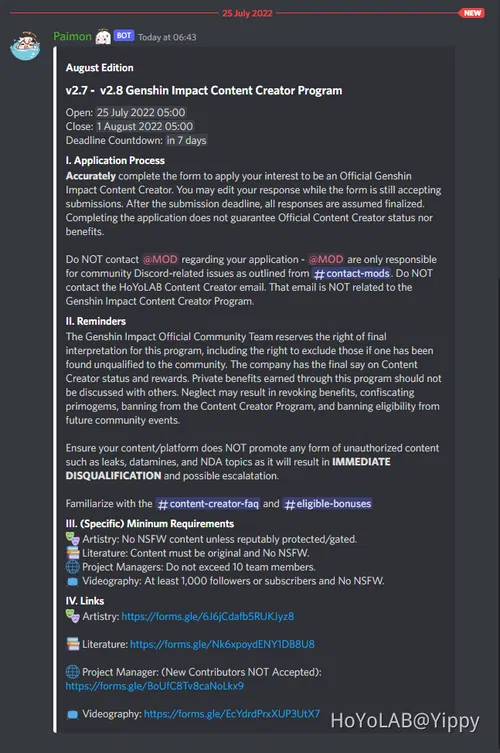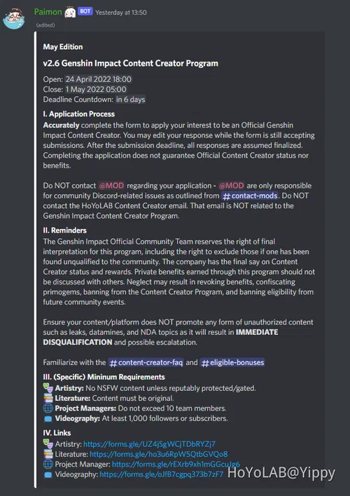Please note that HoYoLAB Content Creator is not the same as Discord Content Creator! Application is now Closed Check my profile for any new Application Form Normally new application forms are available near the end of each month