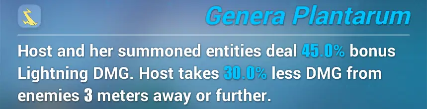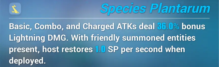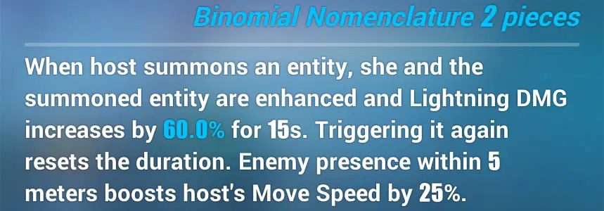 Provides a refreshable and long-lasting 60% Lightning DMG upon summoning an entity and Move Speed bonuses. Extremely recommended for the host to summon an entity before initiating any other forms of DMG.