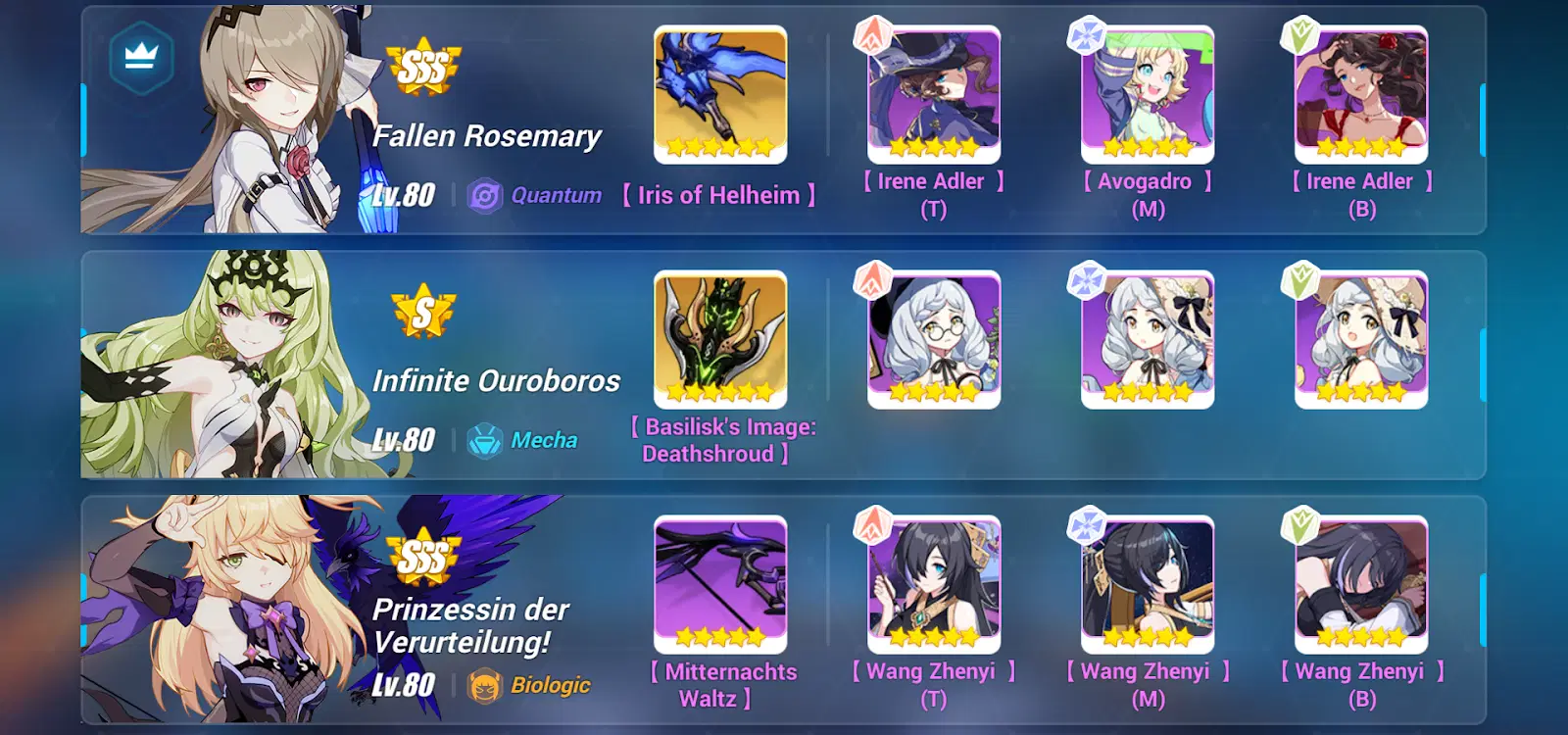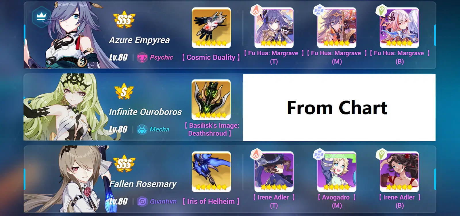 Since the only character who specializes in Ranged Lightning DMG, summoning entities, and Combo ATKs is Infinite Ouroboros, she will be the only DPS testing her signature gear. Fischl was not incorporated into the team to avoid using multiple Zhenyi sets in the same team (which wasn’t provided in the testing phase anyway).