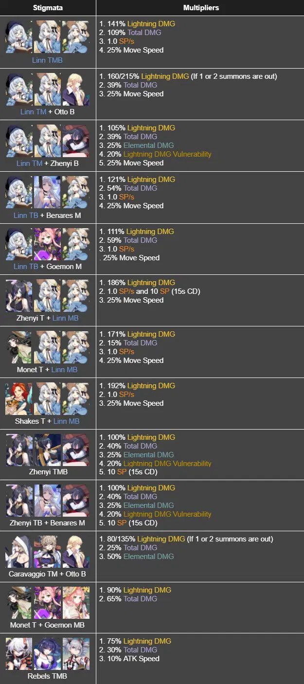 Linnaeus' set is obviously best designed for IO herself. As a DPS-oriented Ranged Lightning character who utilizes Combo ATKs and summons, Infinite Ouroboros is the best choice of host for the stigs to equip onto. Due to the nature of the set, it’s recommended that the host summons an entity and performs a Combo ATK first to best optimize her DMG output.
