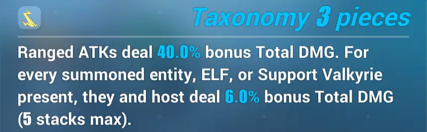In conclusion, the Systema Naturae set: Linnaeus provides a lot of Lightning and Total DMG buffs as well as SP-regen for its host. If you wish to strengthen your Ranged Lightning DPS valkyries who utilize both summons and Combo ATKs, in particular Infinite Ouroboros, then I highly recommend this set for you!