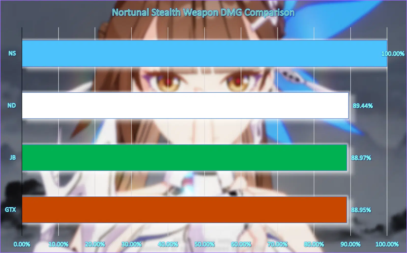 After testing, the best Lv.50 weapon for JK is clearly NS. NS surpassed the other weapons in performance by ~11%. For the others, they all performed nearly the same, so the effects are almost negligible. Do note that JB’s team buff may come to help the team more than ND and GTX.