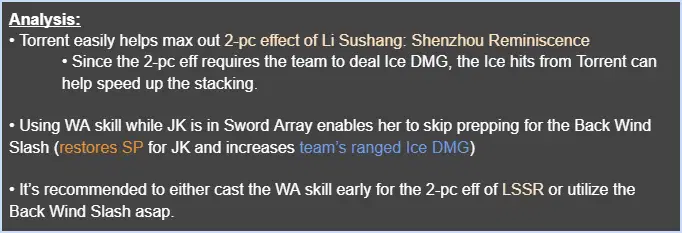 ✦ cast the WA skill (doesn’t matter if the casting lands a hit) so Torrent will max out the 2-pc effect of Li Sushang: Shenzhou Reminiscence by the time your DPS switches in.