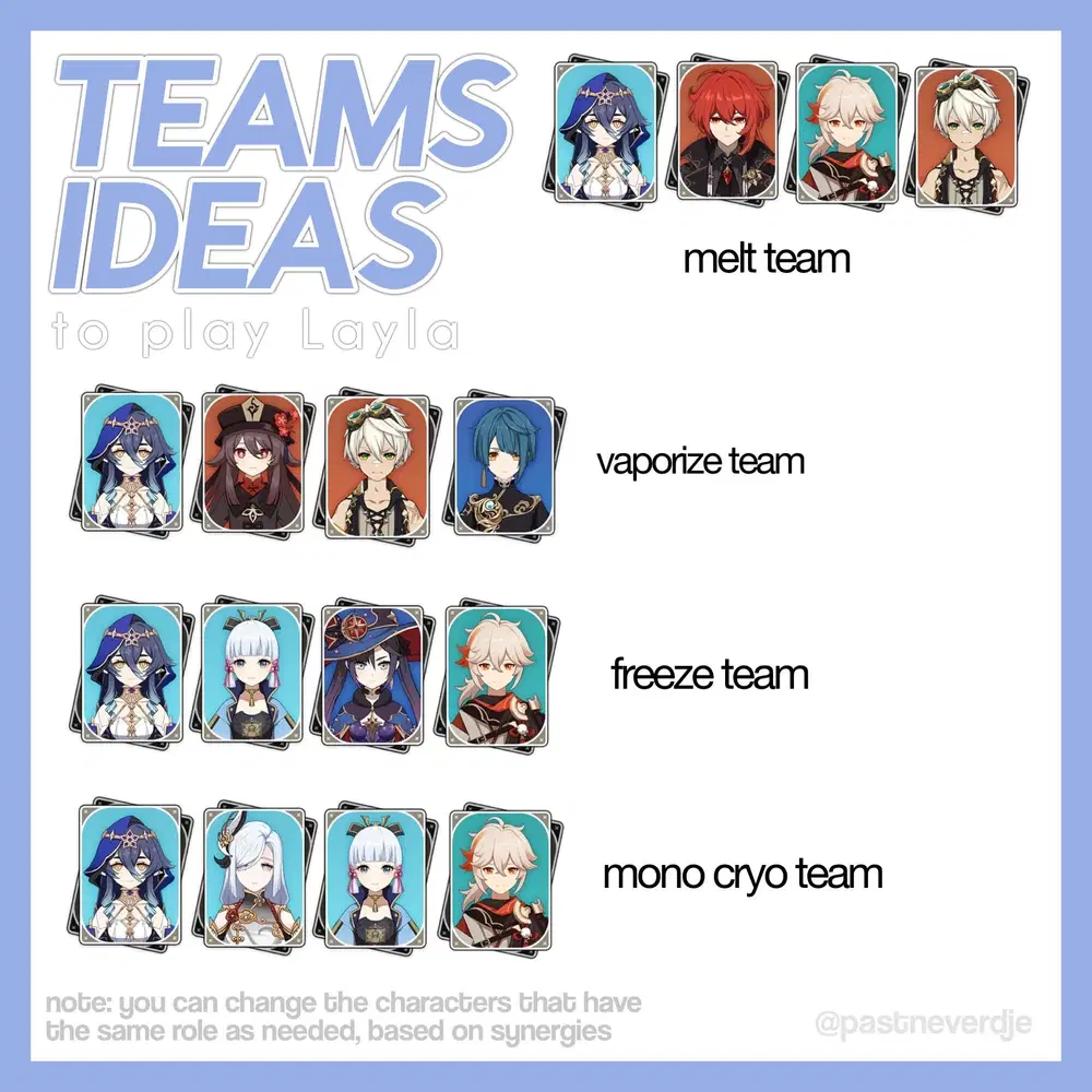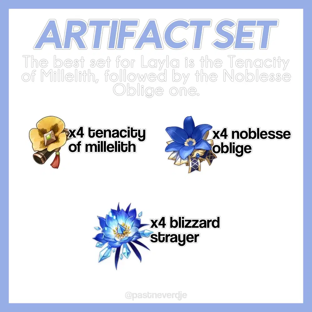 Layla is a 4 star cryo sword character who is a shielder, with a role similar to the Diona's one, that shoots stars and an enabler that inflicts cryo element. Her shield has an hp scaling, so its the best to maximes her hp with both weapon and artifacts. A good thing about Layla is that she doesn't need a lot of energy recharge, so a second cryo character in team is not needed. Indeed she is really versatile and easy to play.