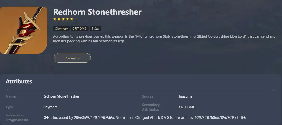 Overall, even if its stats look impressive, Redhorn Stonethresher is still a weapon that has limited versatility in the game. Currently it's only recommended for Arataki Itto, Noelle, and Xinyan mains, since all other characters have better alternatives.