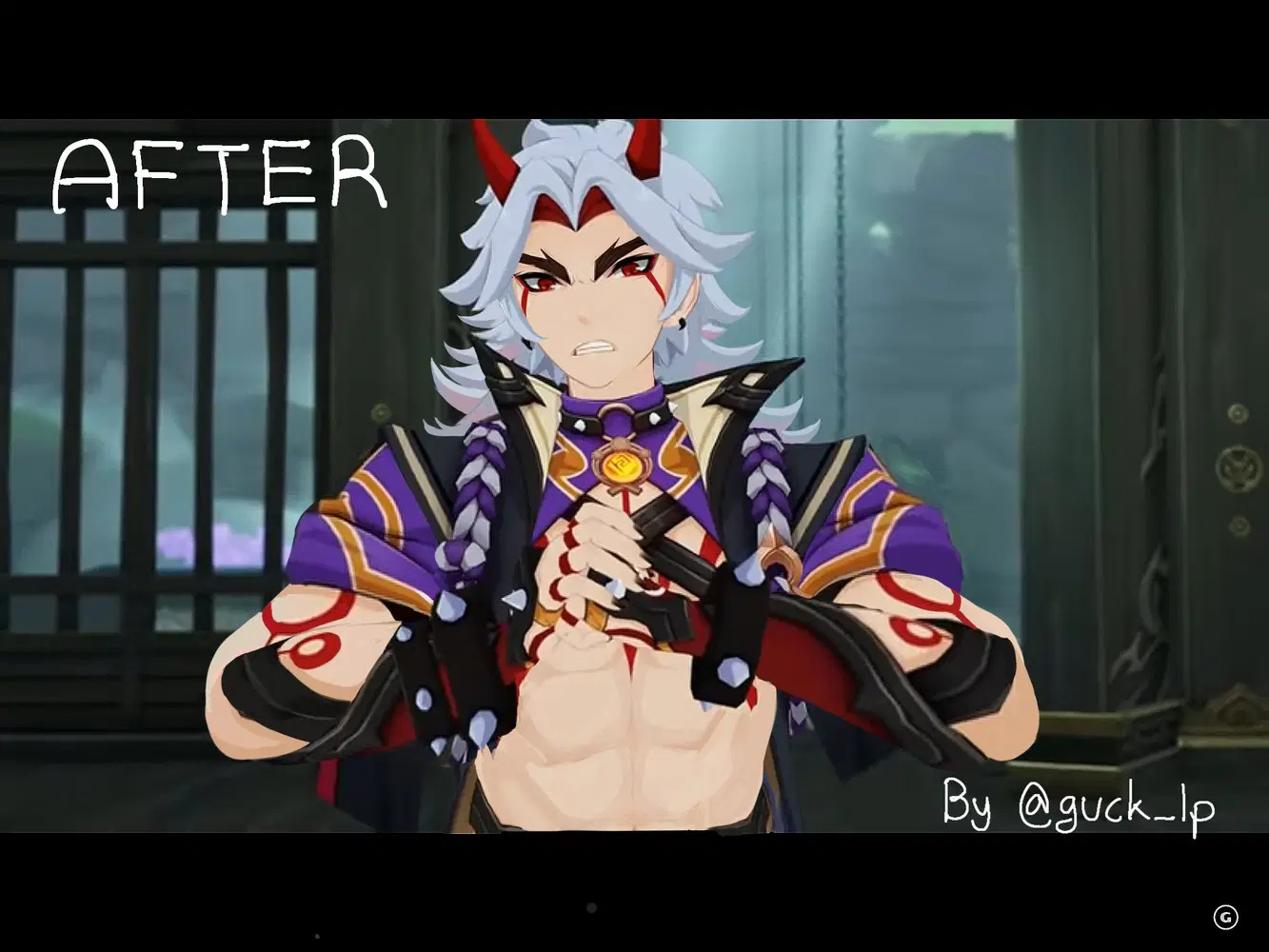 Первое что mihoyo нам показали на анонсе Аратаки Итто - это сплеш арт с его мужественным подкаченным телом, но уже на стриме разработчиков нам выдали абсолютную противоположность его официального арта. Тощие руки, которые удивительным образом могут выдержать очевидно массивные элементы одежды, я уж молчу о том, что из оружия у него двуручный меч... Это по видимому какая-то шутка от mihoyo (было не смешно).