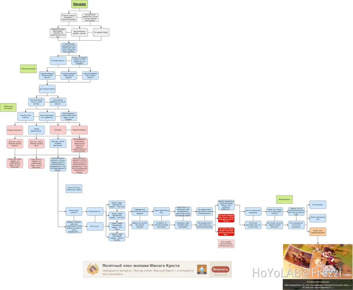 Начало встречи находится на блоке с названием "НАЧАЛО". Линии между диалогами означают, что выбор не имеет значения. Для экономии времени так же можно использовать чекпоинты в меню встреч - в пункте "Задания легенд" выбираете нужный вам момент из уже пройденных ->Начать встречу - вам сразу дадут тот момент, который выбрали и не придётся перепроходить всё заново.