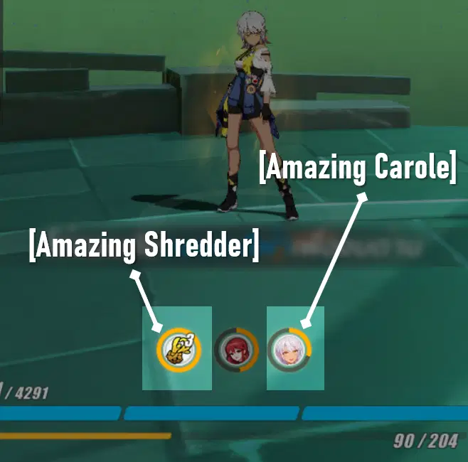 สลับลงมาแบบ QTE กดปุ่มโจมตีรัว ๆ เพื่อเก็บจำนวนซ้อนทับความเสียหายต่อเกราะ (ใช้สกิลอาวุธประจำตัว) จากนั้นชาร์จโจมตีขั้นสูงสุดเพื่อเข้าสู่สถานะ [Amazing Carole] ตามด้วยใช้ท่าไม้ตาย และสลับตัวกับเพื่อนร่วมทีมเพื่อลงมาบัฟต่อ หรือลงมาสร้างความเสียหายได้ทันที