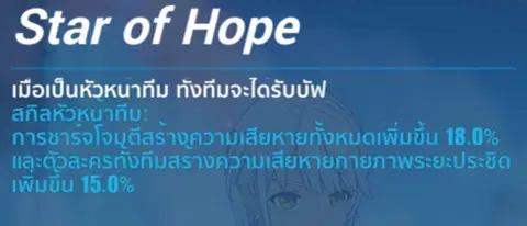 เพิ่มความเสียหายทั้งหมดของท่าชาร์จโจมตีขึ้น 18% และทั้งทีมสร้างความเสียหายกายภาพระยะประชิดเพิ่มขึ้น 15%