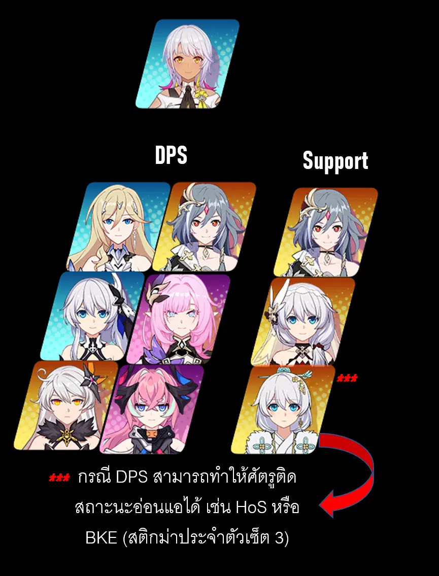 ล่าง: เมื่อชาร์จโจมตี หรือใช้ท่าไม้ตาย ทั้งทีมสร้างความเสียหายทั้งหมดเพิ่มขึ้น 18% เป็นเวลา 20 วิ