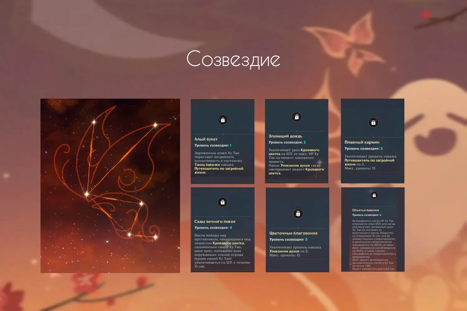 С1 делает геймплей намного более приятным и эффективным. С6, при грамотной сборке, очень сильное созвездие, позволяющее сделать упор на крит.уроне, не обращая внимания на крит.шанс. Остальные звезды пользу дают, но не особо значимую.