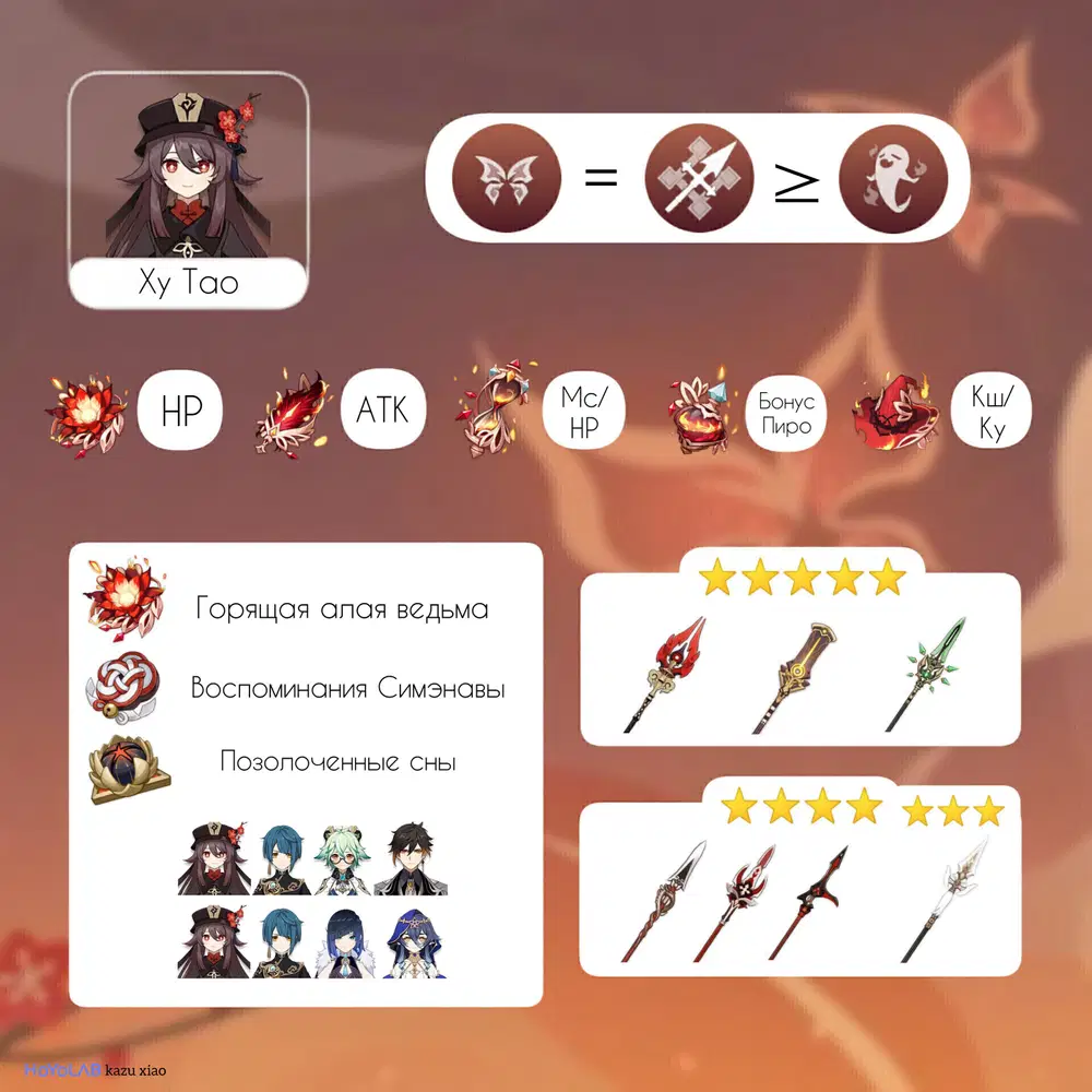 Наносить хороший урон Ху Тао может без созвездий и легендарных оружий. Ей не нужен определённый 5* герой в отряде, хватит и Син Цю (остальные герои отряда строятся вокруг этой связки). Она освобождает Беннета для другой команды, тк не требует его для себя. Имеет выбор сетов артефактов и возможность носить наборы 2 на 2. Считаю, что Тао будет особенно полезна на начальных рангах, чтобы значительно упростить закрытие контента.