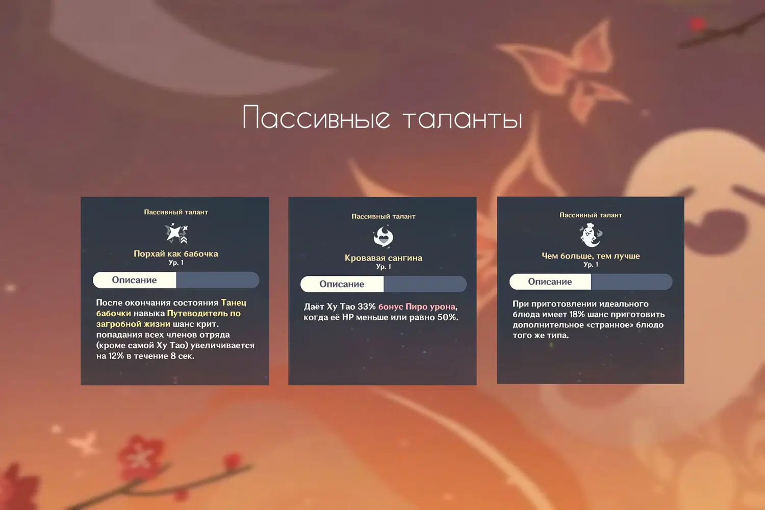 Если HP Ху Тао равно или ниже 50%, в момент попадания по противнику, наносимый урон и количество восстановленного HP увеличиваются.