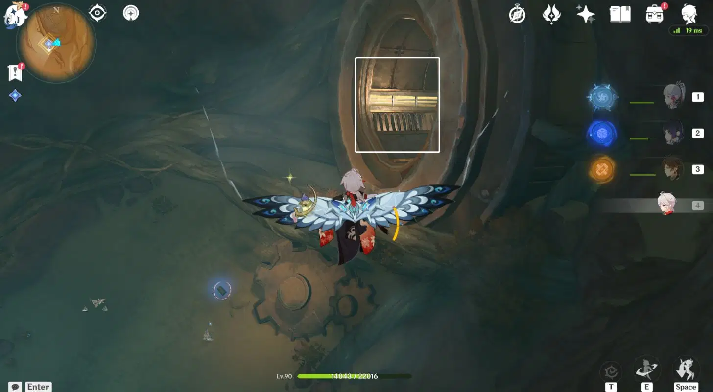 По подсказки Лиллупар, мы решили вернуться внутрь механизма, направившись на юго-запад карты, используя четырёхлистный символ и пролетев весь путь внутрь, а отсюда – войдите в тоннель через проход в машине.