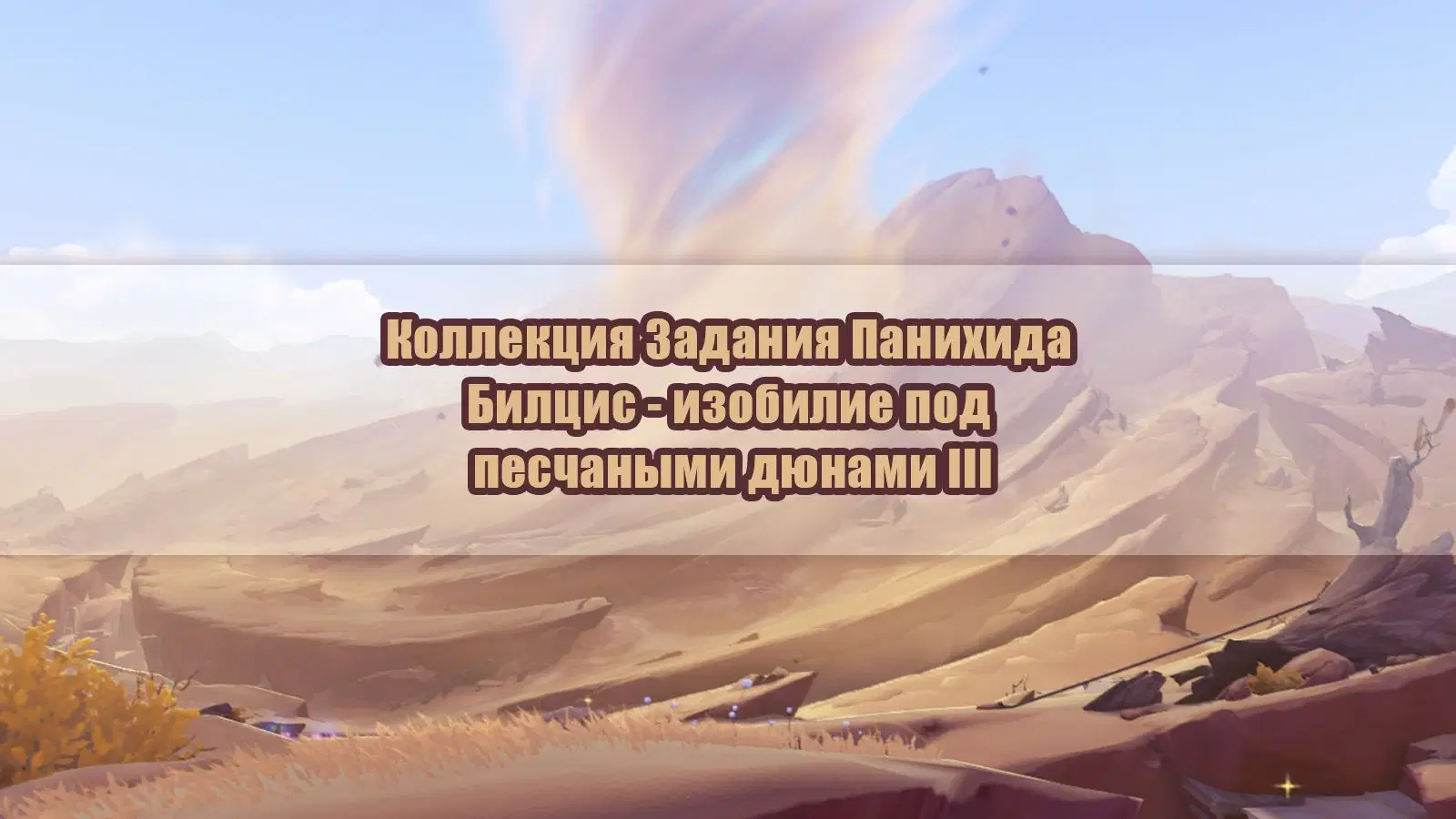 Описание задания: Это задание входит в серию заданий Панихида Билцис в пустынном мире Сумеру и это задание является заданием открытия карты для области Пустыня Хадрамавет и после выполнения его можно разблокировать недоступные области и получить возможность взаимодействовать с новыми механизмами.