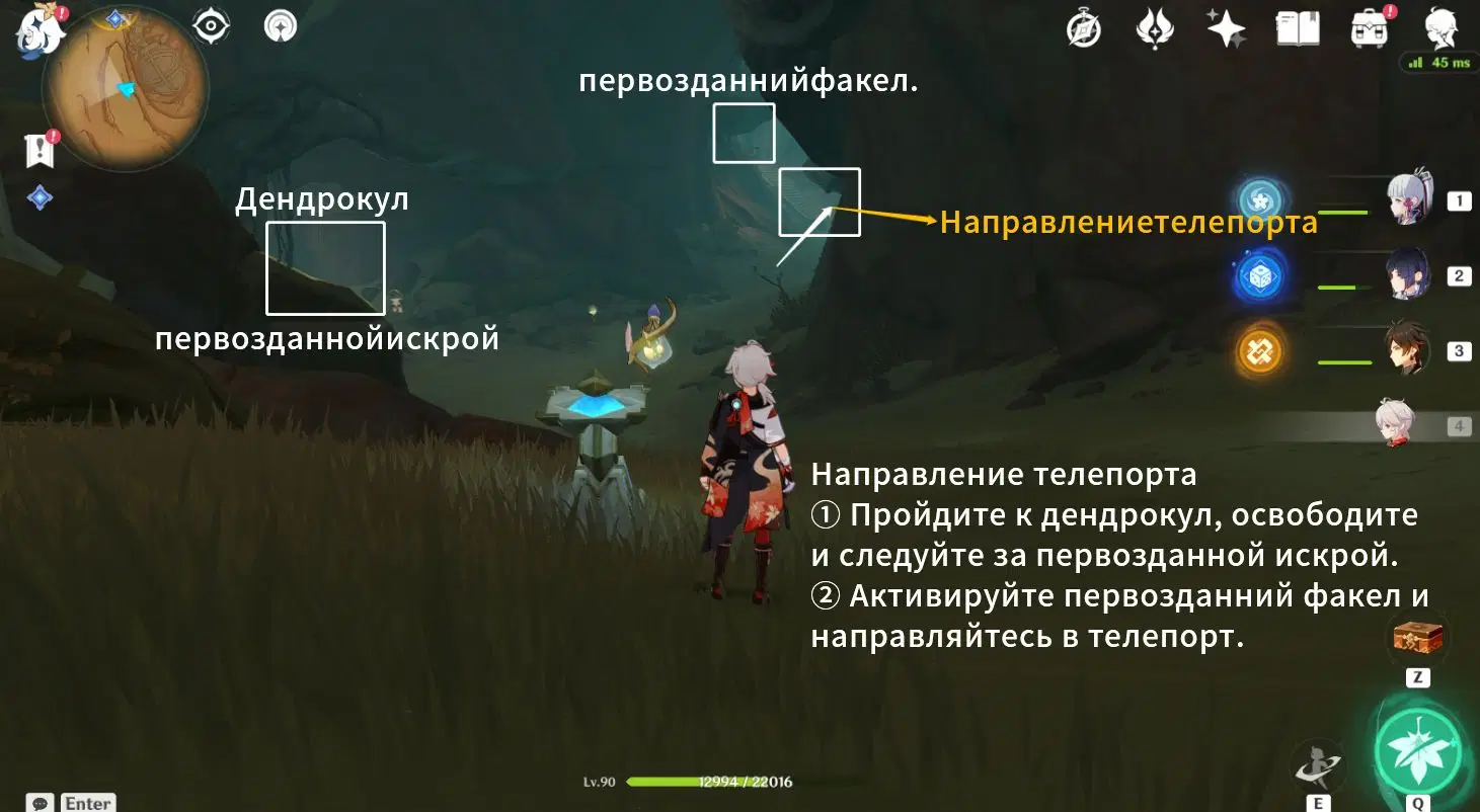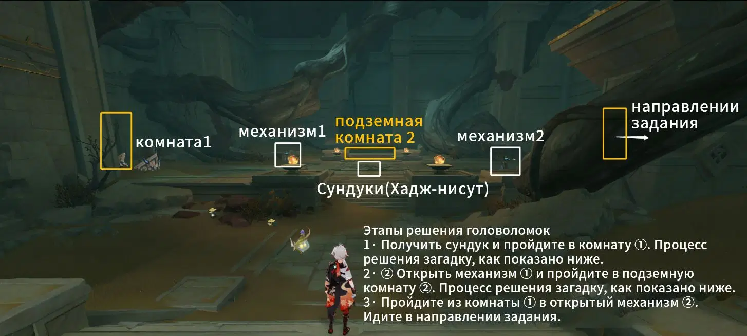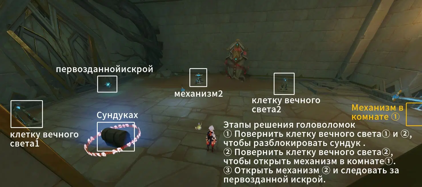 Комната 2: Идите в подземную комнату ②, следуйте за первозданной искрой и выполните действия, указанные на карте, чтобы решить загадку.