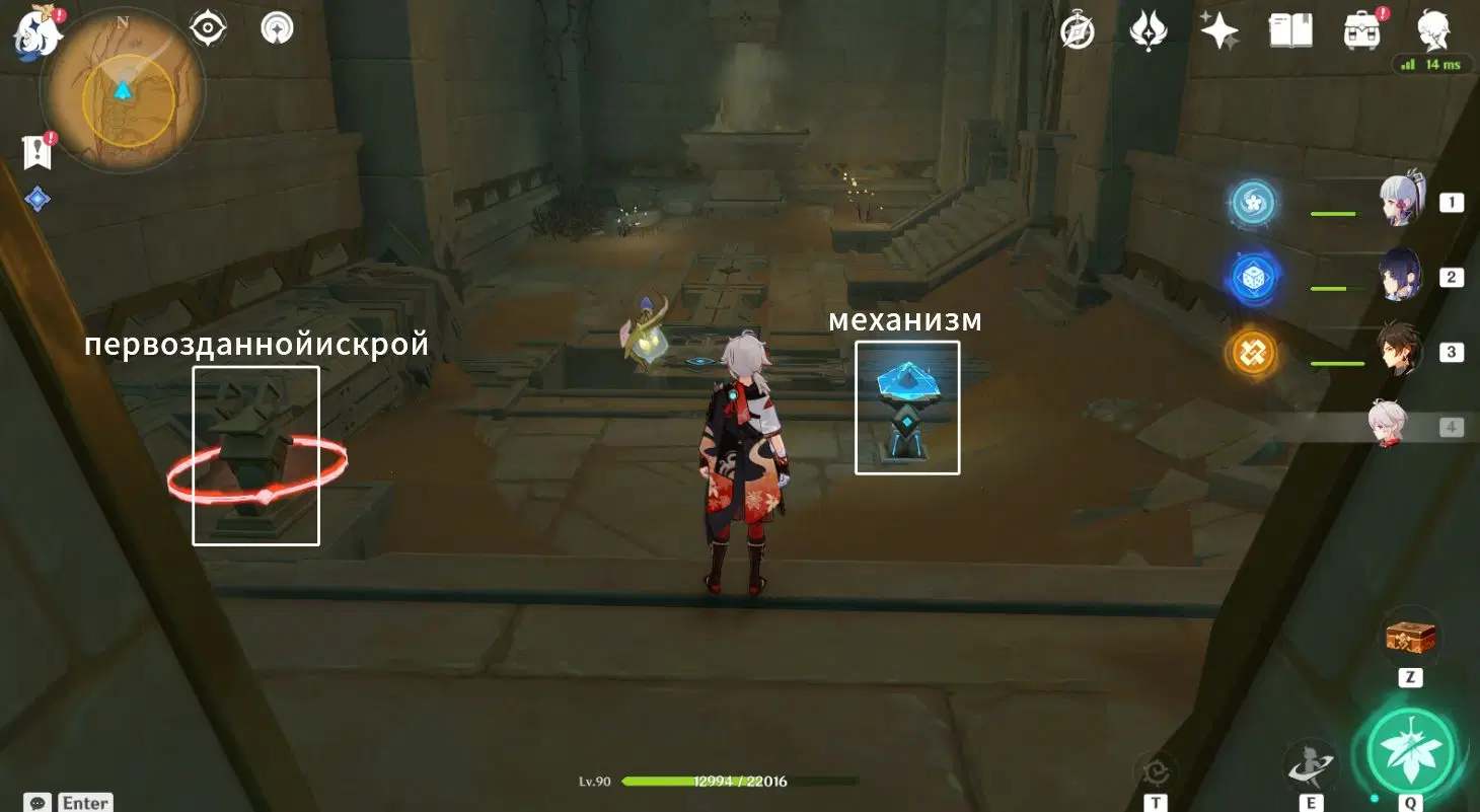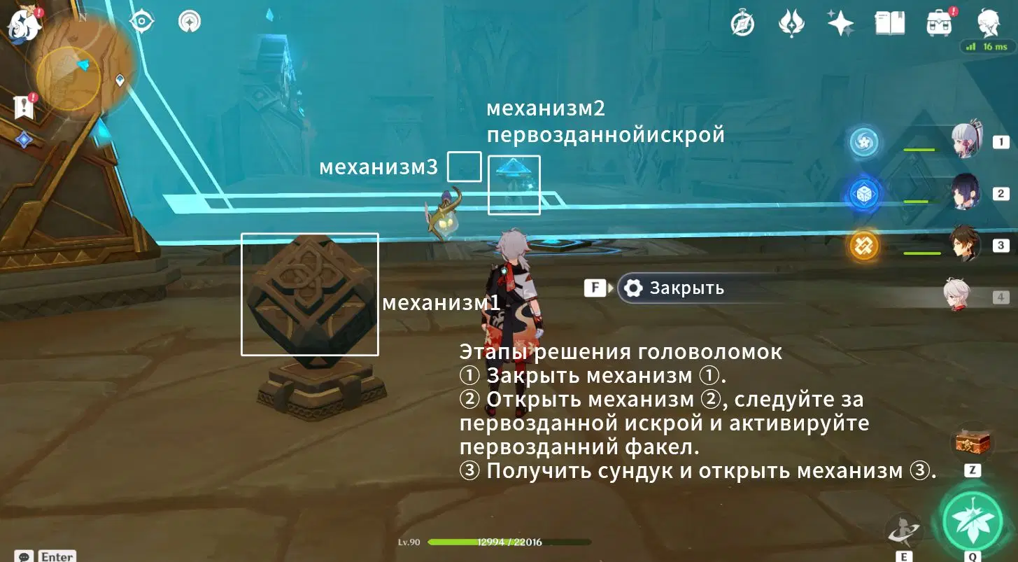 Комната 1: Идите в комнату ①, откройте механизм и освободите и следуйте за первозданной искрой.