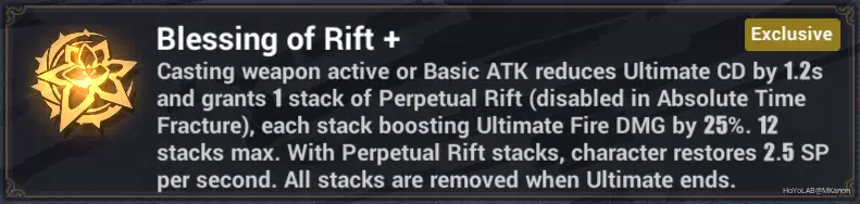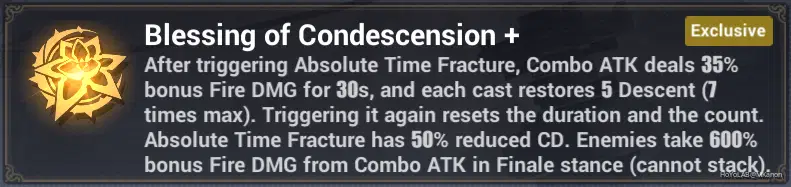 For Combo Atk Build. This signet is crucial for this build and it is the one that enable HoFi to spam her Combo Atk non-stop and also increasing her dmg by a huge amount while she's in Finale stance (after using Absolute Time Fracture, ATF). She will recover 5 Descent points every time she use Combo Atk for 7 times at max. This is a great upgrade especially if she's equipped with her signature weapon that will restore 3 Descent points every time the WA is used. However, without her signature weapon, things will get a little difficult. Some Basic Atk must be done to restore the Descent points slowly, which make the rotation less smooth IMO.