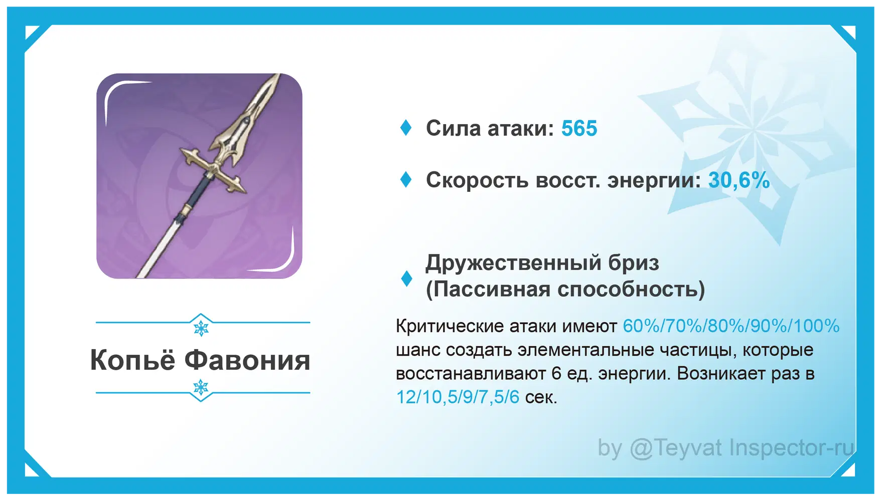 Когда экипировать персонажа копьем Фавония, дучше складывается шанс крит. попадания (50% приблизительно) для увеличения вероятности активации его пассивных эффектов.