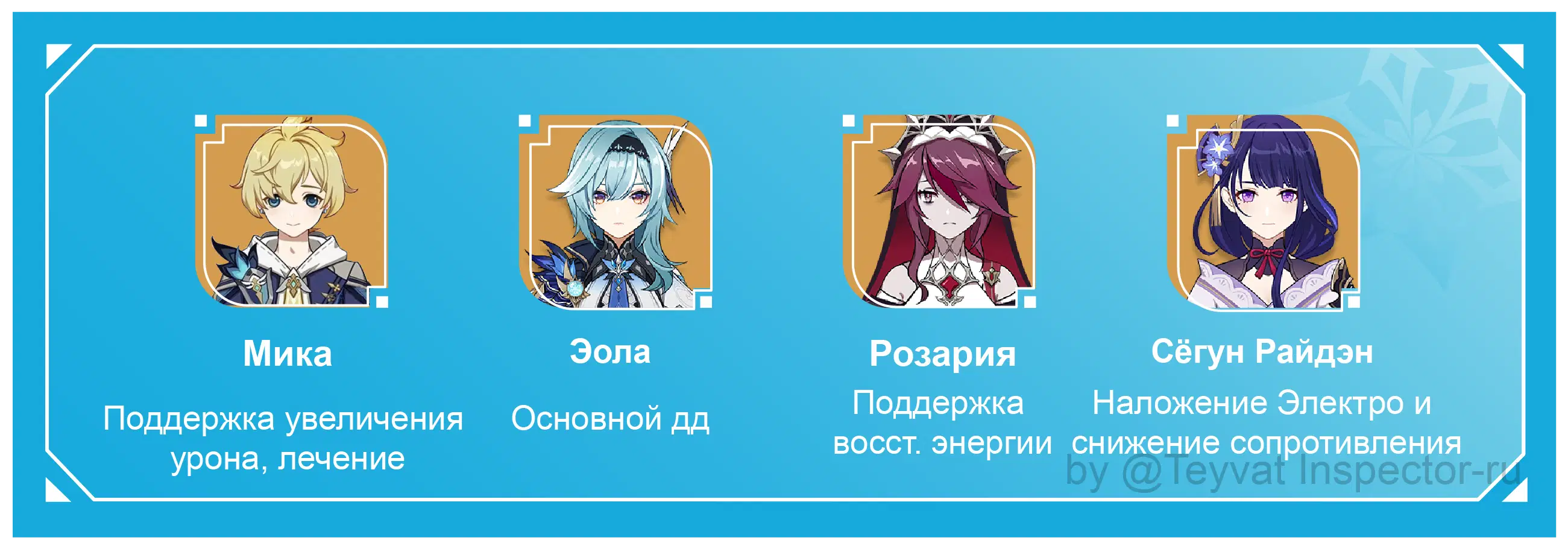 Рекомендуемый четвертый персонаж - Сёгун Райдэн, Фишль, Яэ Мико и другие персонажи, которые вне поля боя накладывают Электро.