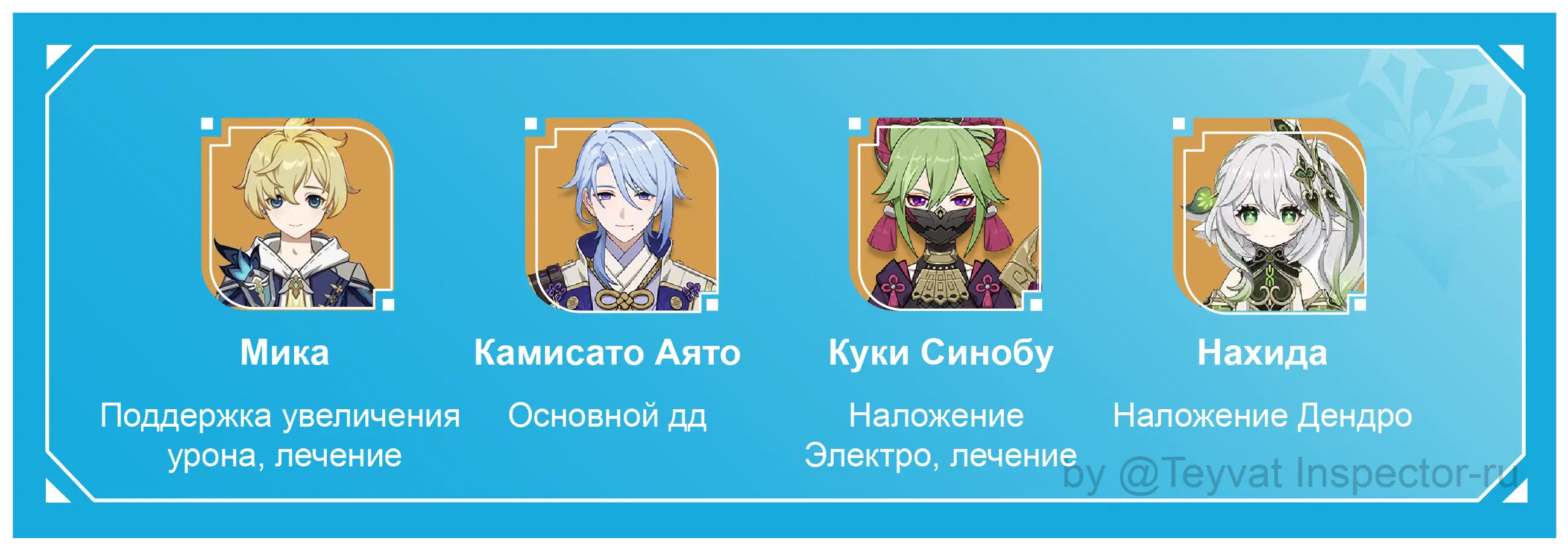 Нахида E → Камисато Аято Q → Куки Синобу E → Мика EQ → Камисато Аято E дальше обычная атака