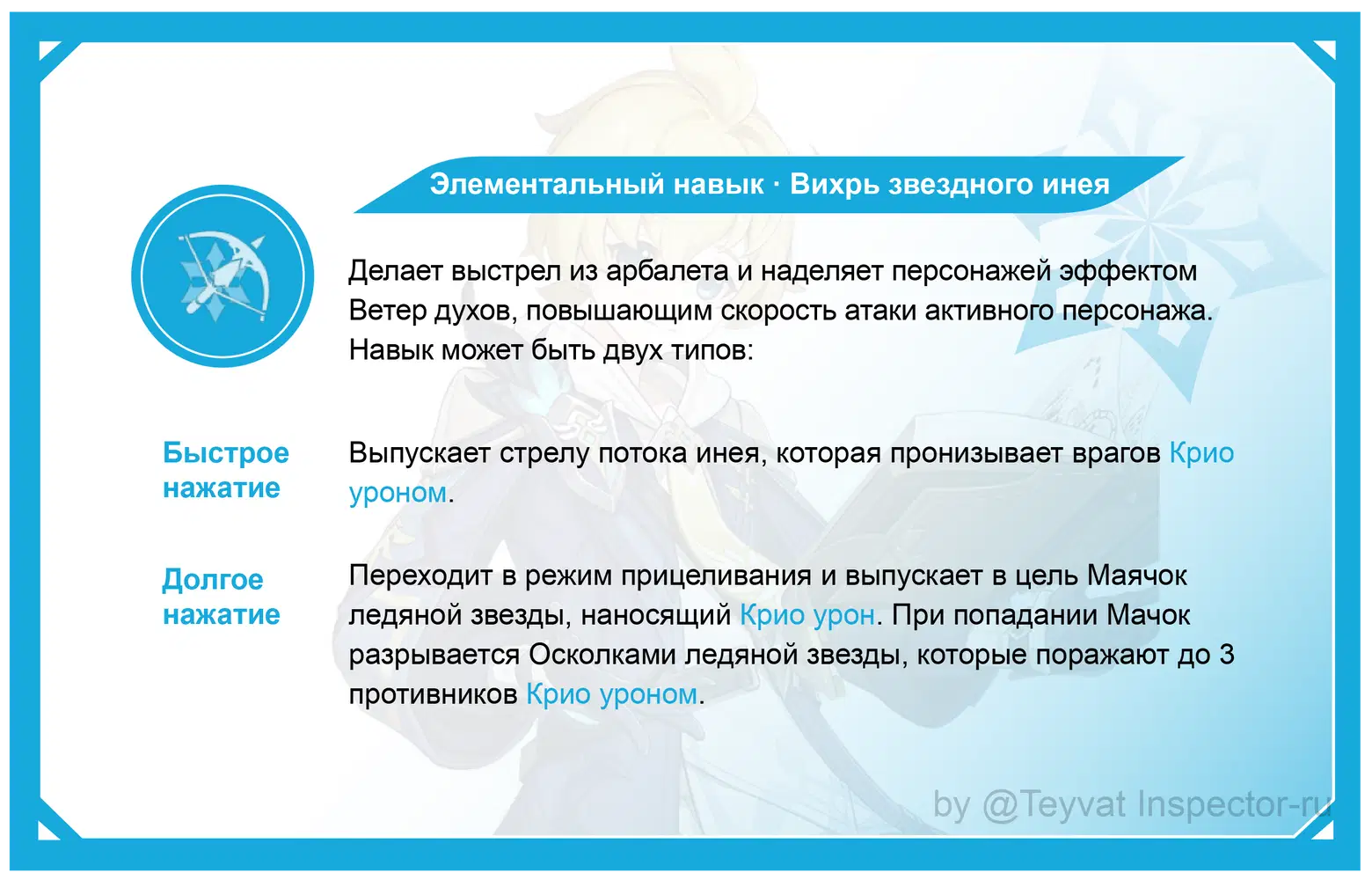 При быстром и долгим нажатием накладывает слабый Крио элемент, после попадания по врагу создает 4 элементальной частицы.