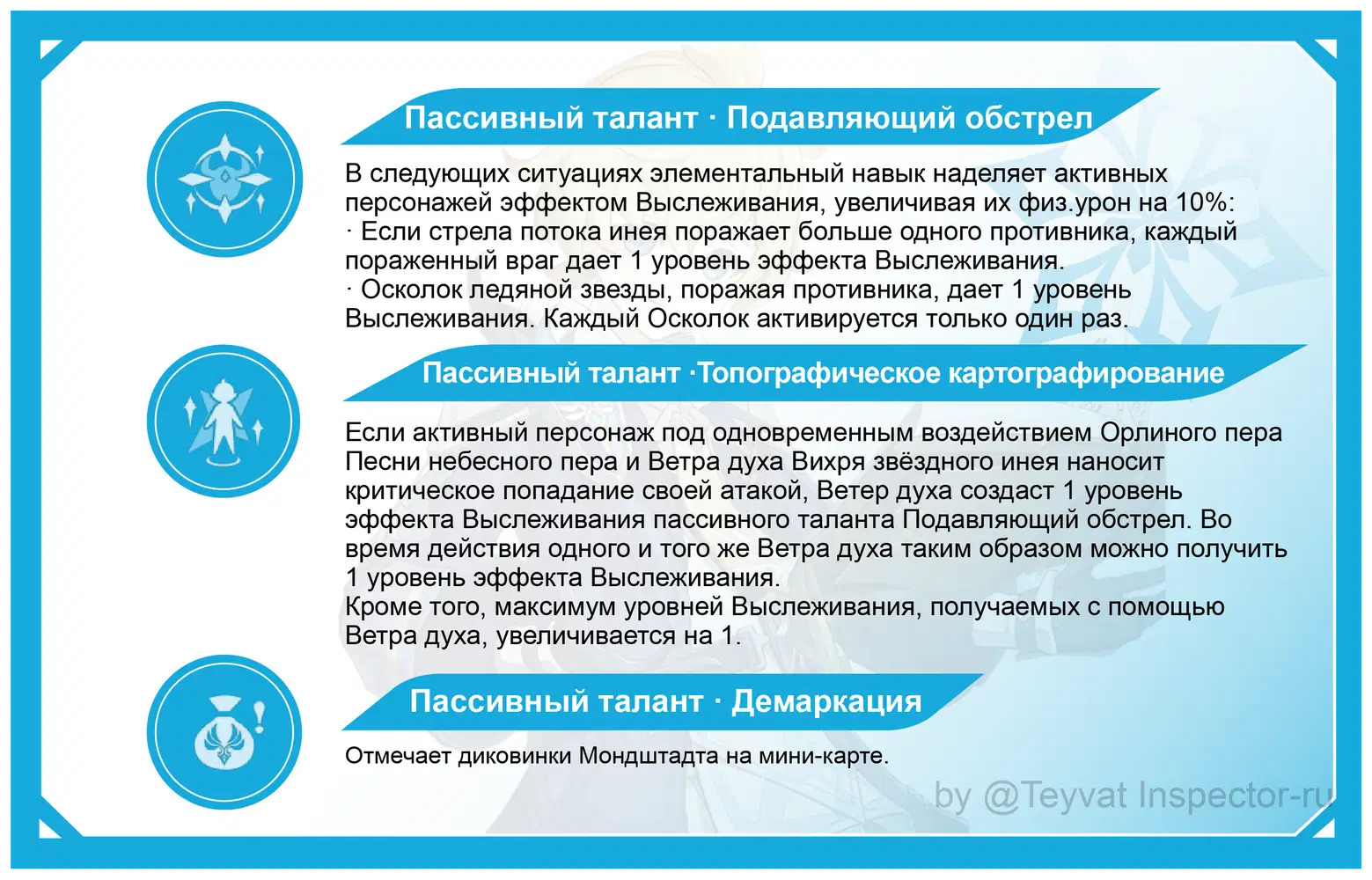 Под одновременным воздействием эффектов, соответствующих взрыву стихий и элементальному навыку, данный талант увеличивает лимит уровня Выслеживания на 1; но в общем увеличение не большое, поэтому не обязательно каждый раз активировать взрыв стихии.