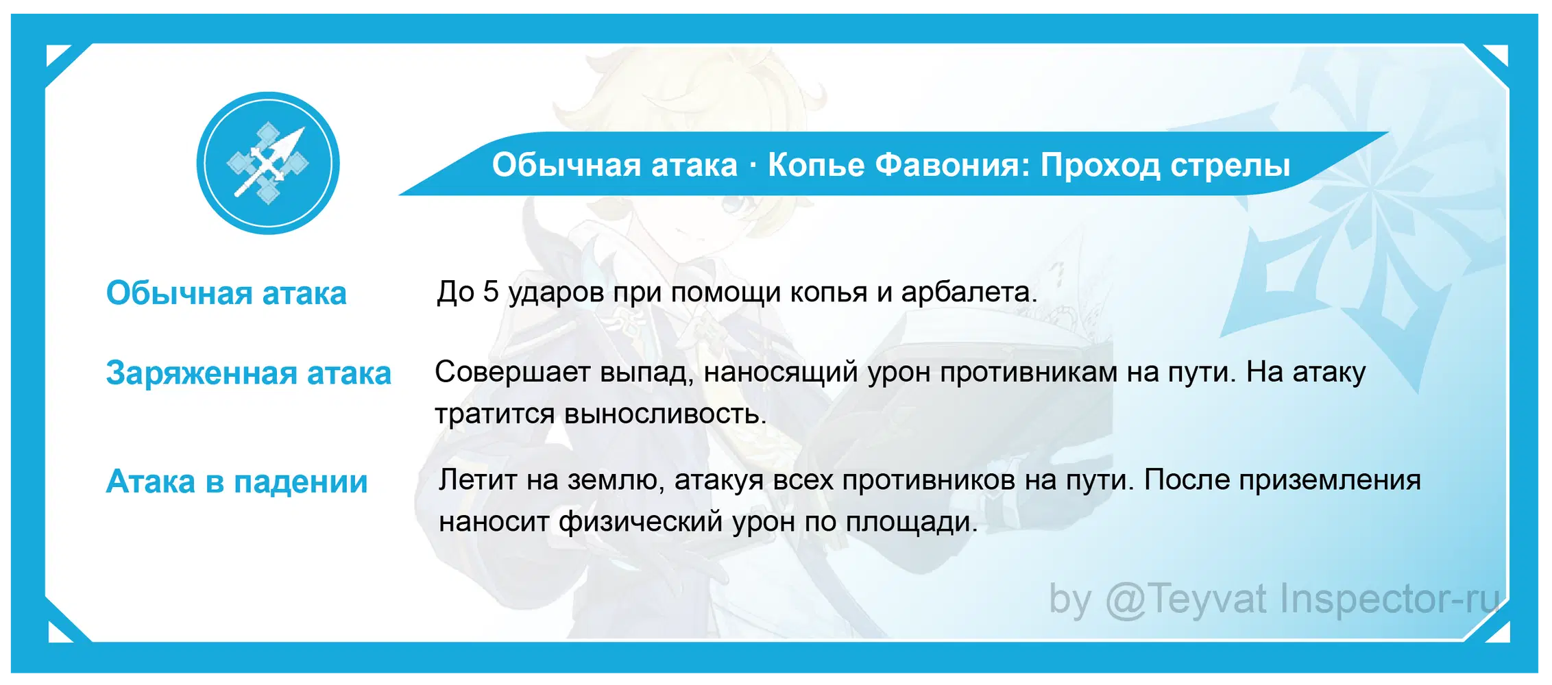При помощи арбалета и копья последовательно наносит до 5 ударов, всего 6 раз урона, среди них четвертая атака наносит урон 2 раза, остальные удары по одному урону.