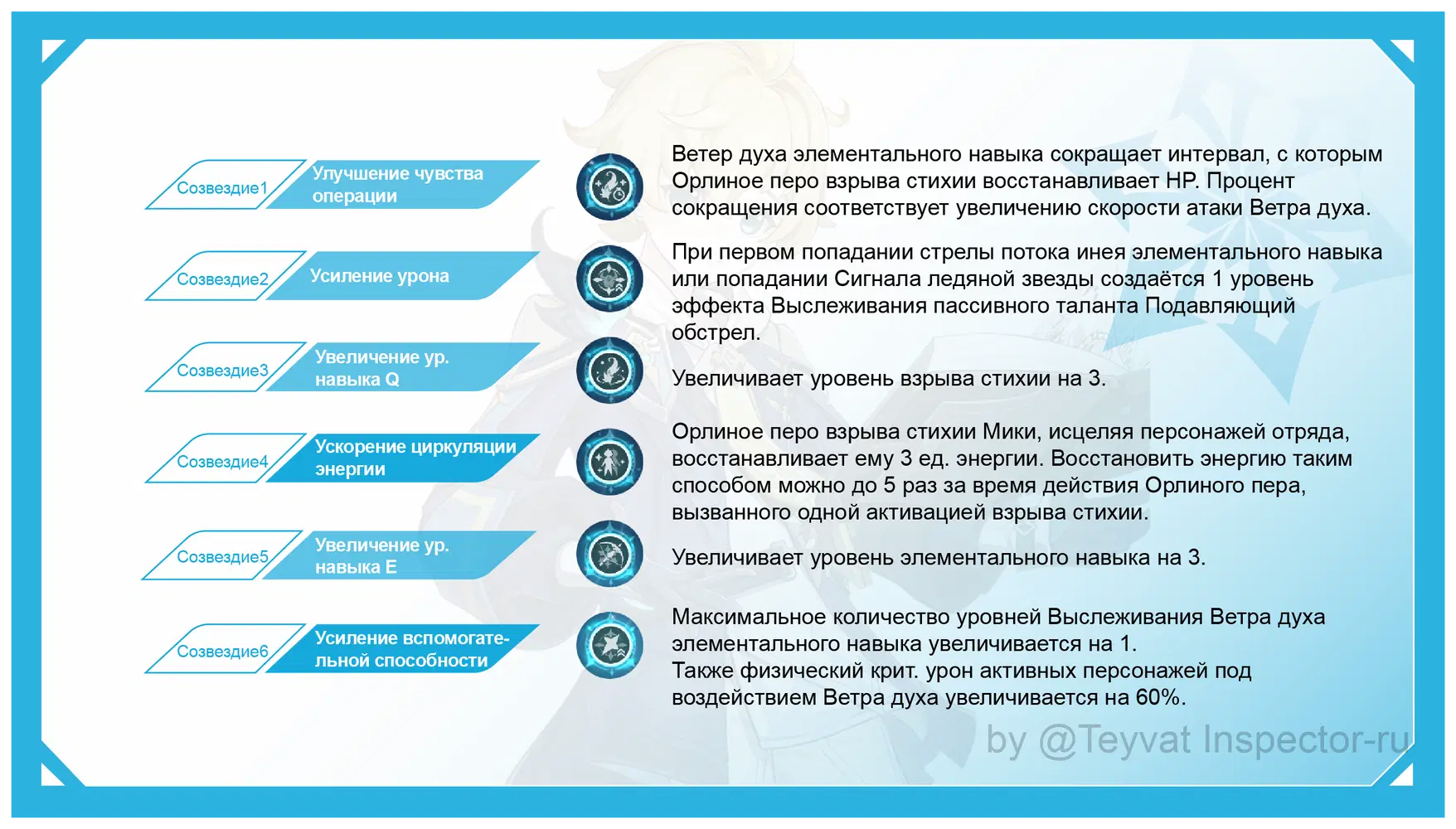 Созвездие 6 увеличивает уровень эффекта Выслеживания Ветра духов на 1, максимально до ур.5; физический крит. урон персонажей под воздействием Ветра духов увеличивается, обратитесь к эффектам созвездия 6 Горо, Фарузана и других, такие критический урон не показан на параметрах персонажей.