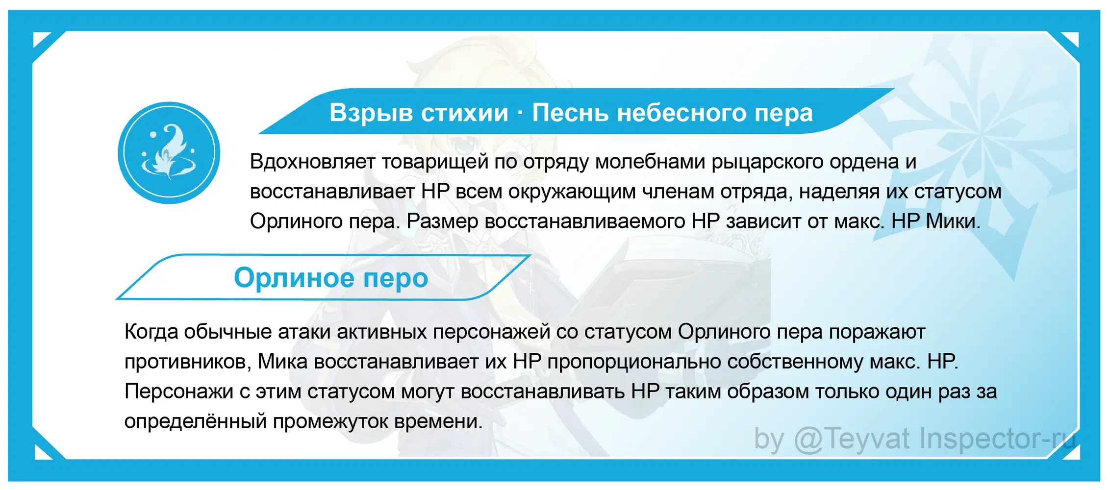 Мика является 4-звездочным Крио копейщиком, его взрыв стихии и элементальный навык дают основные активные эффекты, в игре он редкая поддержка увеличения скорости физ. атаки, при выборе персонажей он предоставляет чрезвычайную удобность.