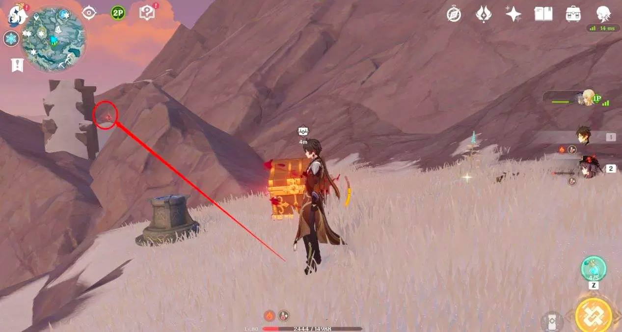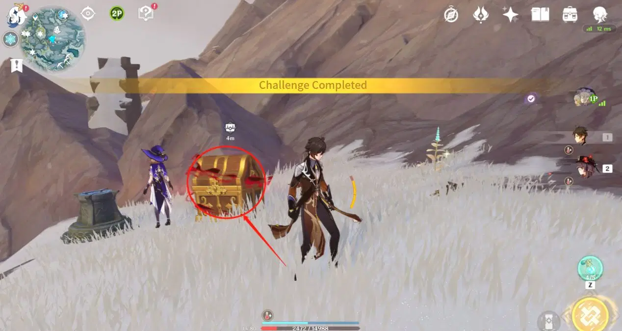 Return to the Waypoint north of Entombed City and head south. Complete a Time Trial for Crimson Agate 26. It’s in the chest after you complete the trial. There are three waves of monsters in the Time Trial: the first contains three Hilichurls, two Ice Shieldwall Mitachurl in the second and a Frostarm Lawachurl in the third.