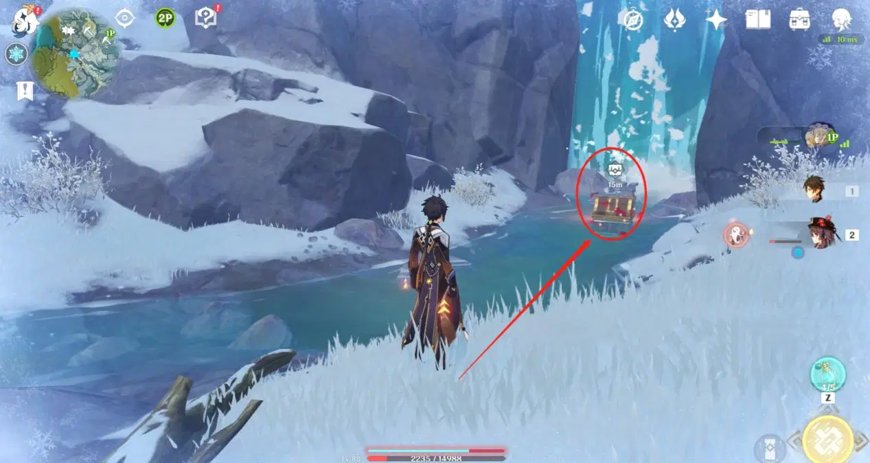 Continue to the south, defeat Frostarm Lawachurl and the other Hilichurls around. You will find this Crimson Agate in the chest at the bottom of the waterfall.