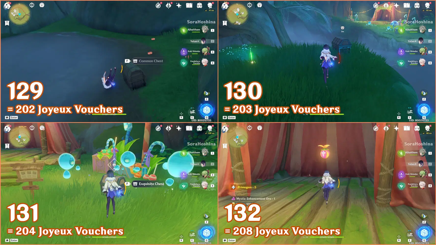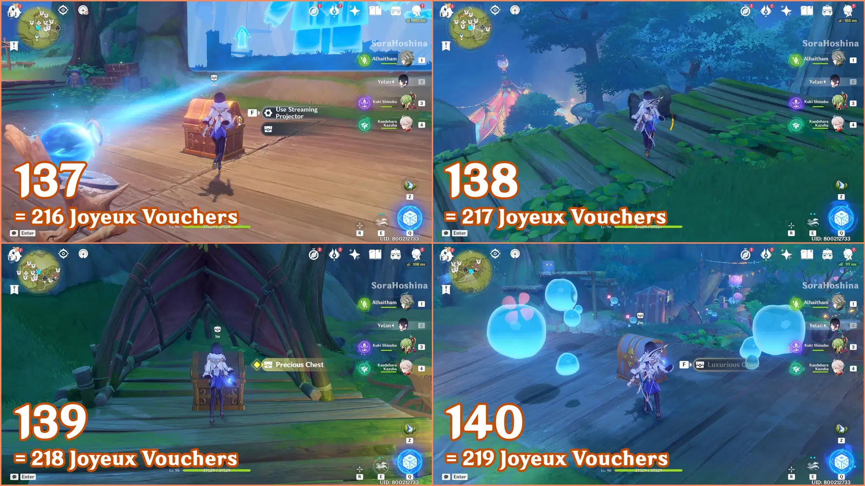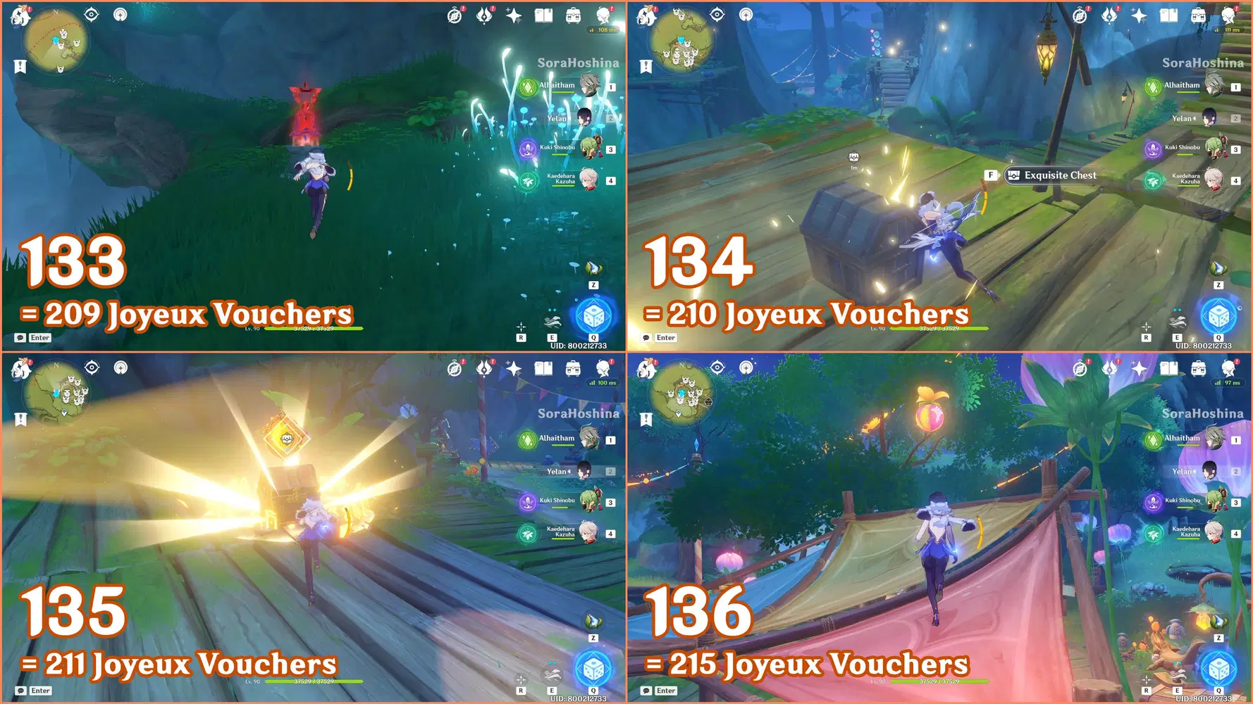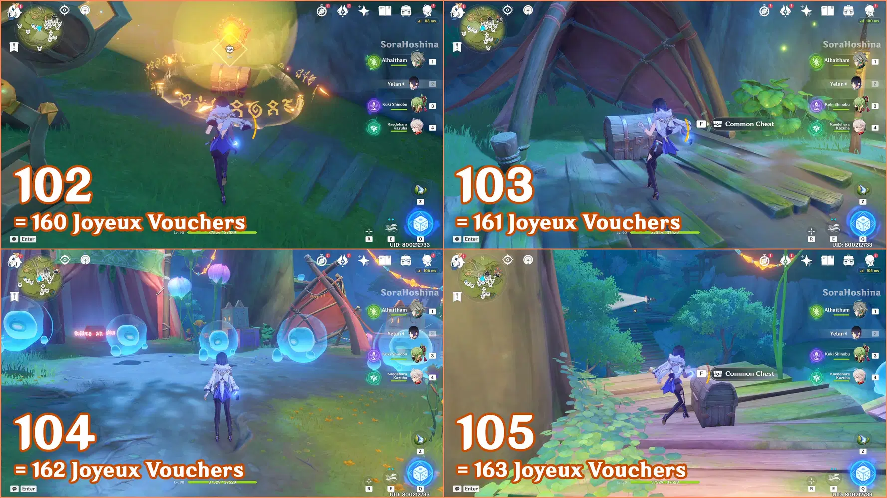 ✦ If you followed my first part of the Joyeux Voucher guide, you should have 155 Joyeux Vouchers and Flowing Joyspar gadgets. Remember that this gadget can help you find Fascinating Chests and Voucher Boxes in AoE areas.