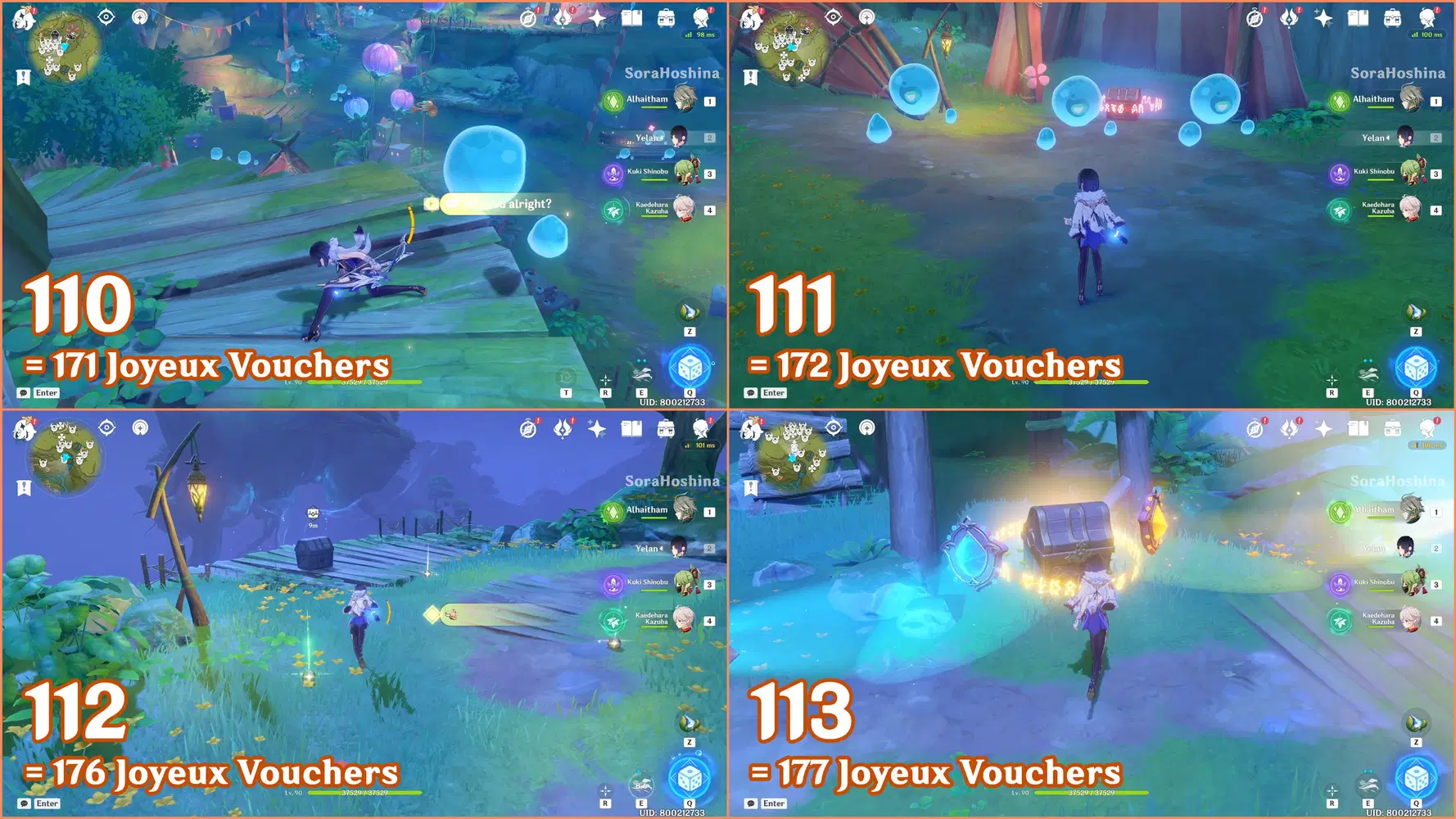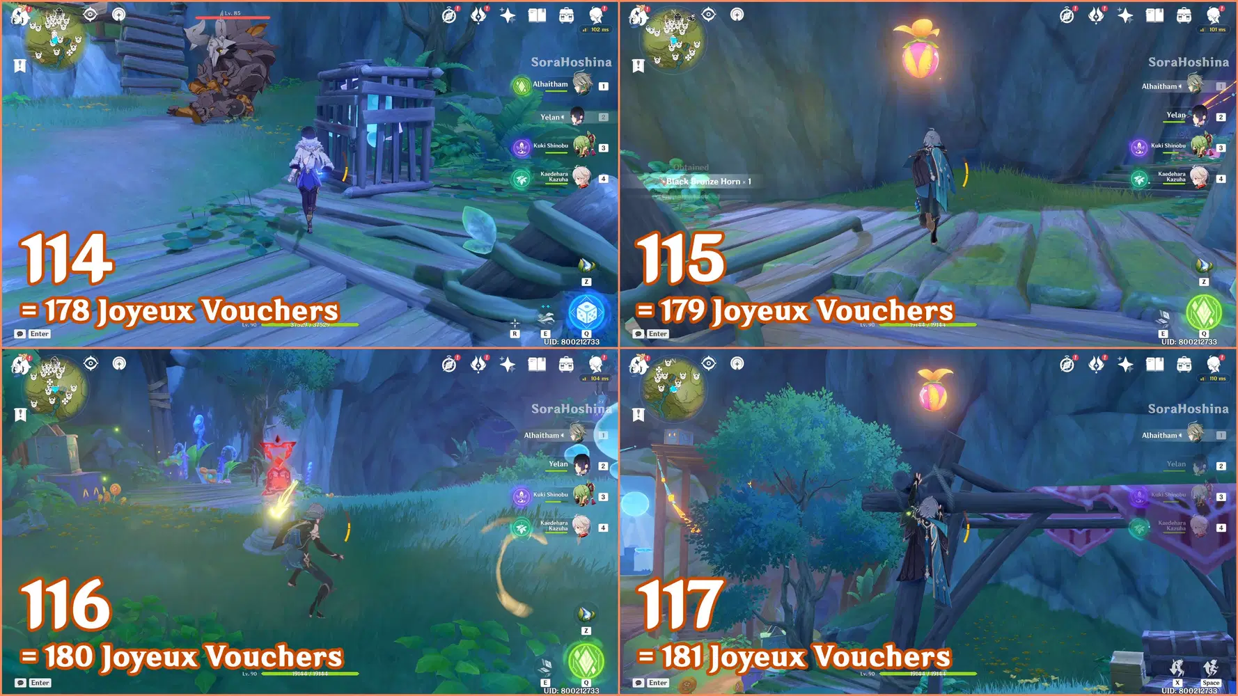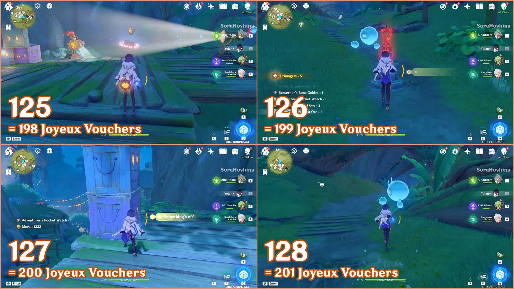 ✦ If you followed my first part of the Joyeux Voucher guide, you should have 155 Joyeux Vouchers and Flowing Joyspar gadgets. Remember that this gadget can help you find Fascinating Chests and Voucher Boxes in AoE areas.