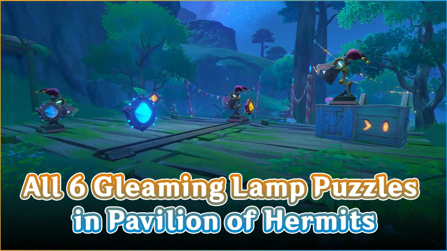 120. Keep following the path towards the east to find a Gleaming Lamp puzzle. The solution is too long to write so here's the guide for all Gleaming Lamp puzzles in the Pavilion of Hermits.