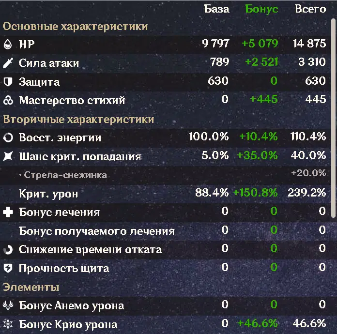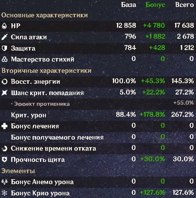 Начну пожалуй с вопроса шанса крита с крио сэтом на Аяке. Крио сэт при идеальных условиях и крио резонансе заливает дополнительно на все тычки целых 55% крит шанса. Число не маленькое и можно подумать, что можно спокойно забыть о кш для Аяки, набирая только уйму критического урона, атаки и вэ. Удобно, но так ли всё просто?