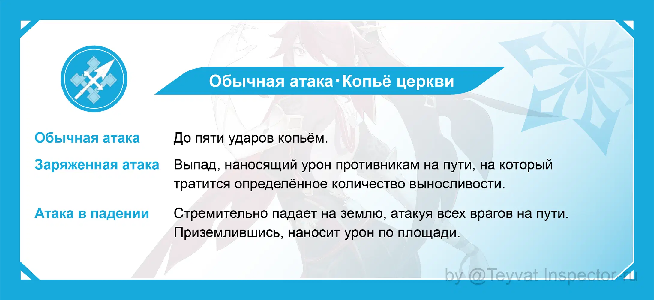 ① Обычная атака выполняет 5 ударов, которые относительно плавные, одна ротация составляет около 3-4 секунд, что является основным средством дамага, когда она служит основным дамагеров физ. урона, множитель заряженной атаки не низкий, но восстановление после атаки долгое.