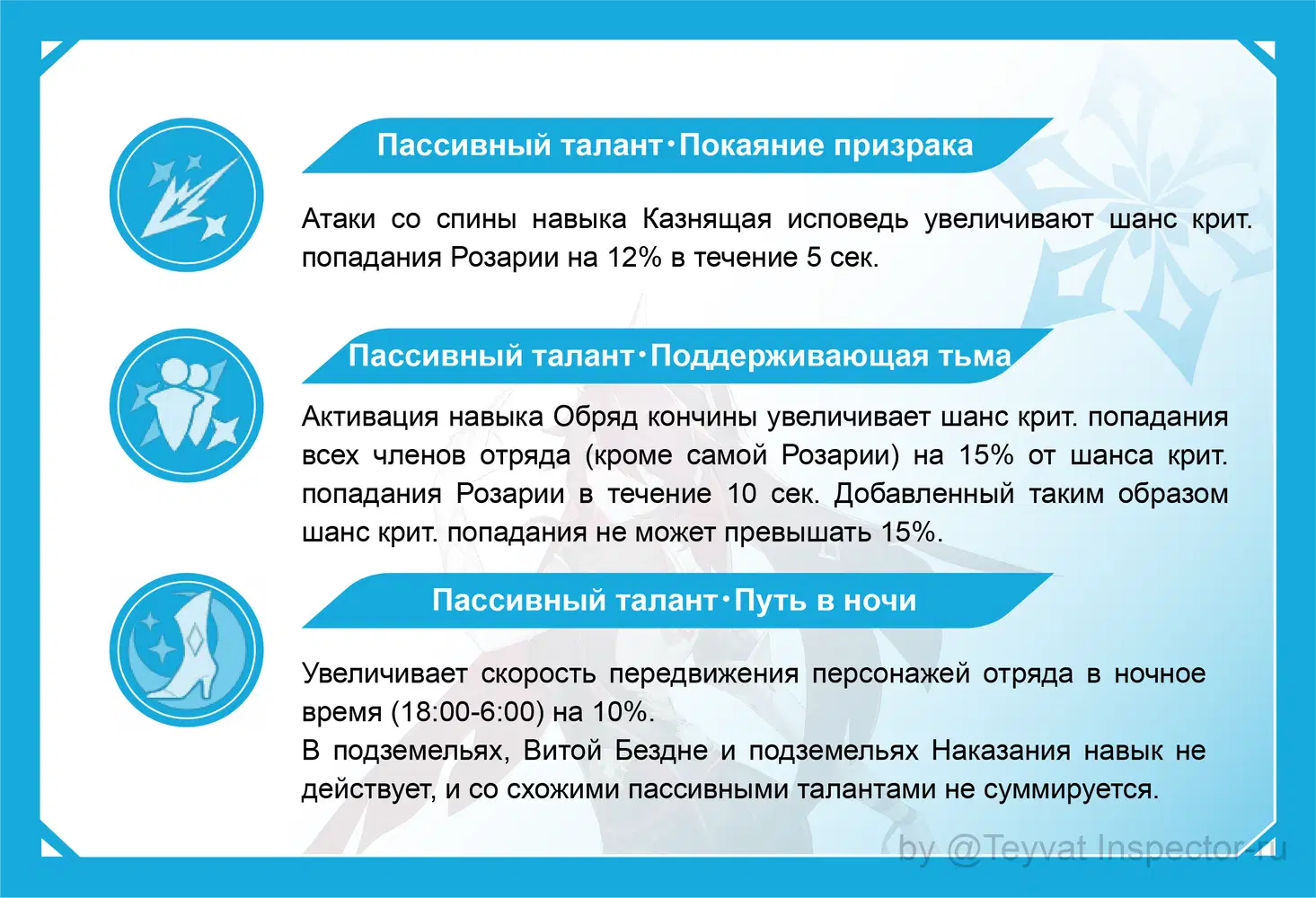 ② Когда взрыв стихии активирутеся, он может активировать пассивный талант Розарии «Поддерживающая тьма», а при активации взрыв стихии увеличивает крит. шанс других членов отряда на 15% от крит. шанса Розарии в течение 10 секунд, максимум до 15%.