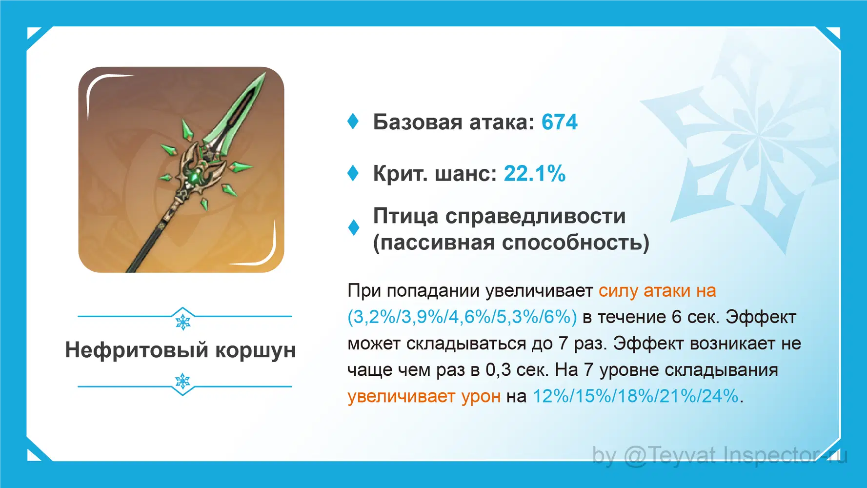 «Нефритовый коршун», как необходимое оружие для персонажа обычной атаки с копьем, обеспечивает крит. шанс и высокое белое значение, и его эффект увеличения урона, несомненно, делает его лучшим выбором как для нанесения Крио урона, так и для нанесения физического урона.