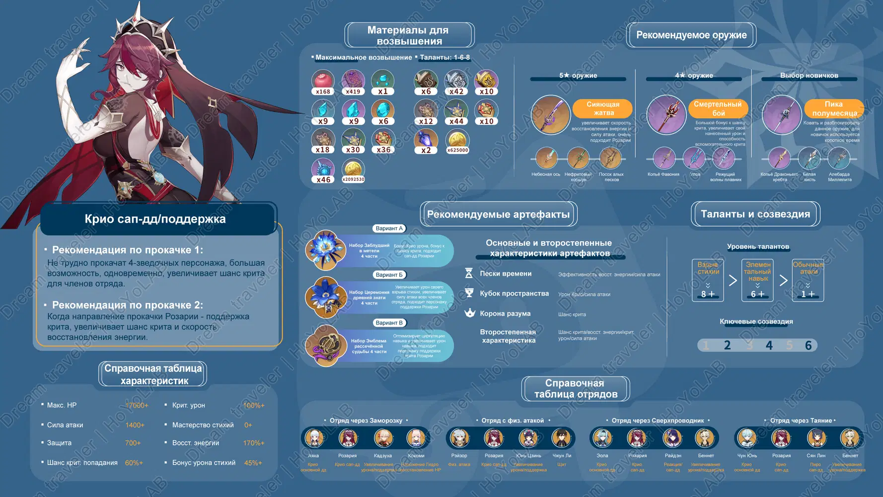 Розария может приспосабливаться к множеству различных позиций в зависимости от уровня прокачки путешественников и ситуации в команде, включая, помимо прочего, для быстрого переключения / Крио дамагер вне поля, саппорт физ. урона, Крио дамагер, дамагер физ. урона, и она также может одновременно принять вышеуказанные множественные ориентации в реальном бою. Поэтому, если используете ее как основного дамагера, при добавлении очков талантов приоритет отдается прокачке обычной атаки, за которой следует взрыва стихии, рекомендуется повышать до 8/6/8 и выше. Если используете ее в качестве саб-дд и чистого саппорта крит. попадания, то приоритет отдается улучшению взрыва стихи, за которыми следуют элементальный навык, рекомендуется повышать до 1/6/8 и выше.