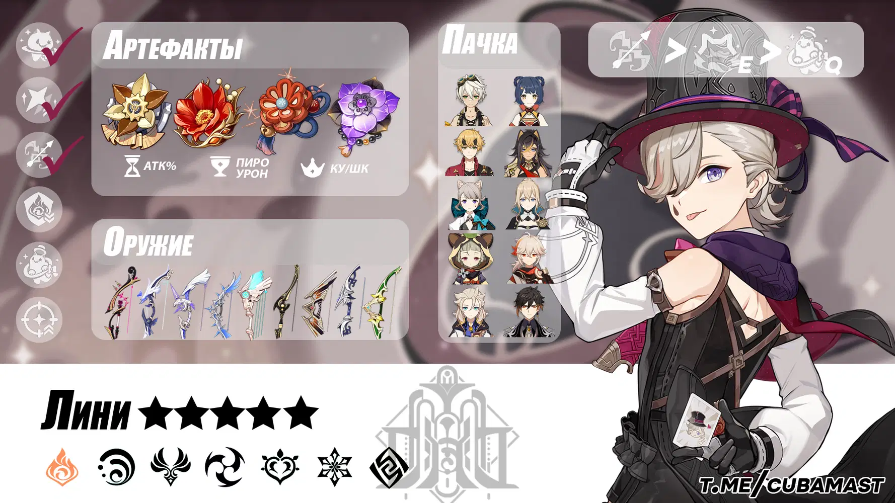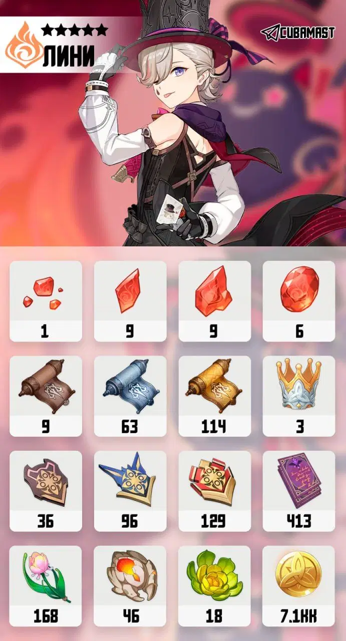 Лини – Пиро персонаж из Фонтейна, выступающий в роли мейн ДД от заряженных атак. При возвышении у него повышается Крит Шанс и на 90 уровне возвышения он будет составлять 24,2%