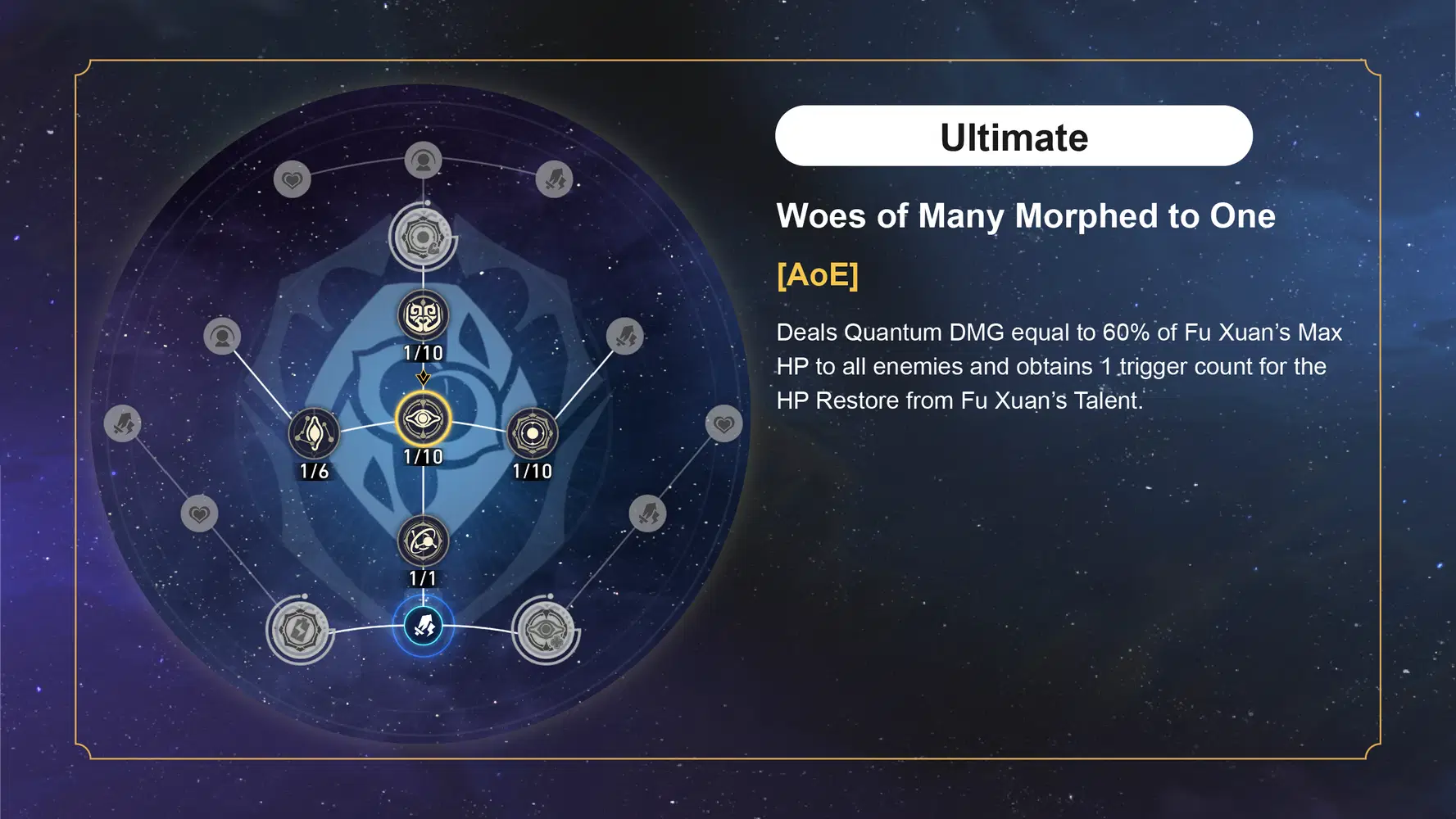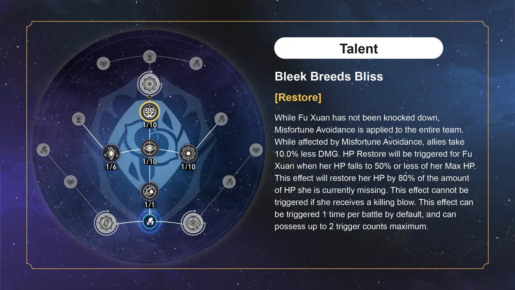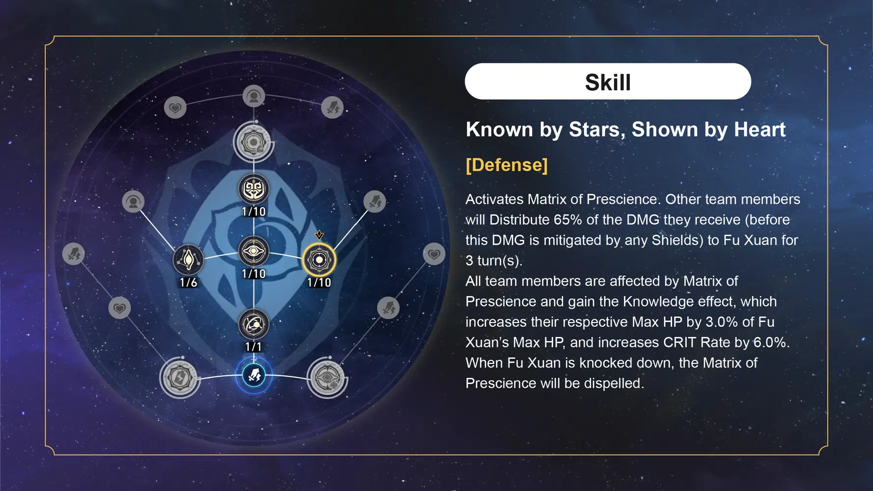 Fu Xuan’s core ability, recommended to max this one out first. It provides DMG reduction as well as Max HP and CRIT Rate buffs and is one of the strongest support abilities.