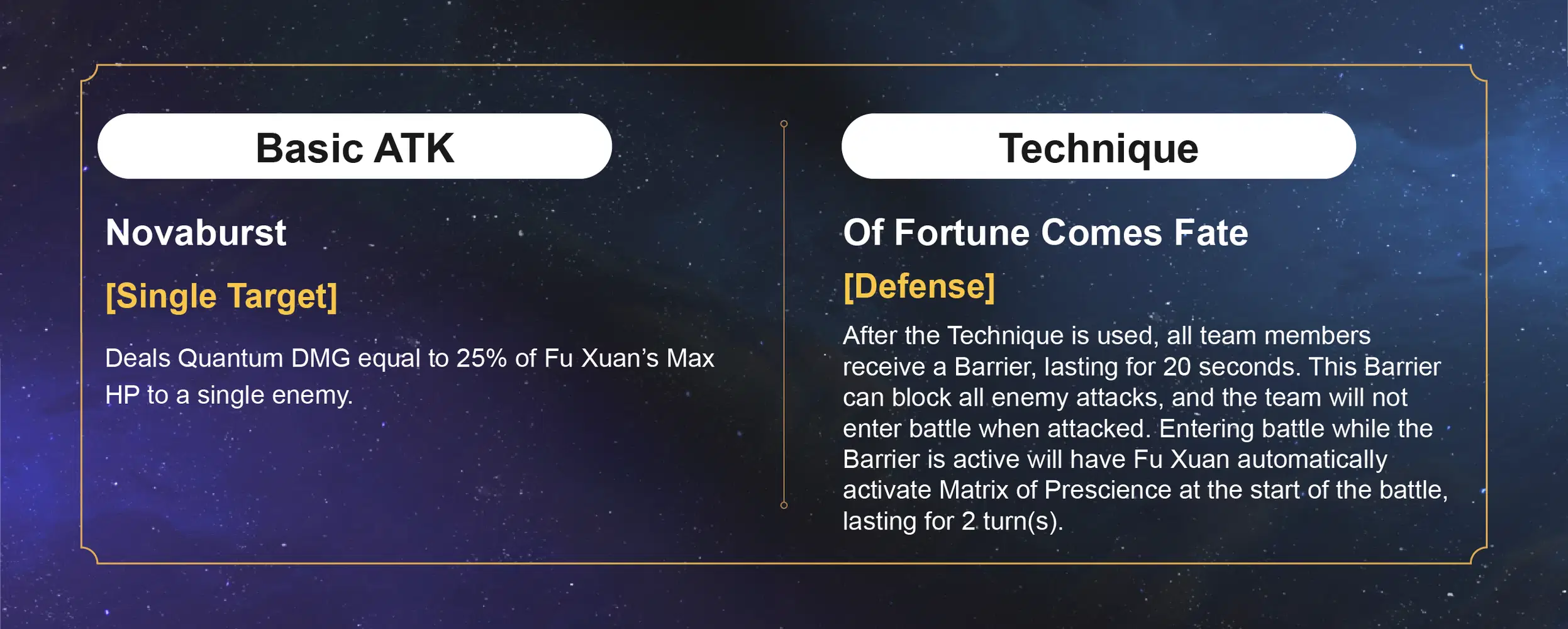 Upon entering battle with this ability active, Matrix of Prescience will be activated and can effectively prevent allies from losing HP before Fu Xuan’s turn, so the Technique is also useful in saving Skill Points and buffing the team with some early protection.