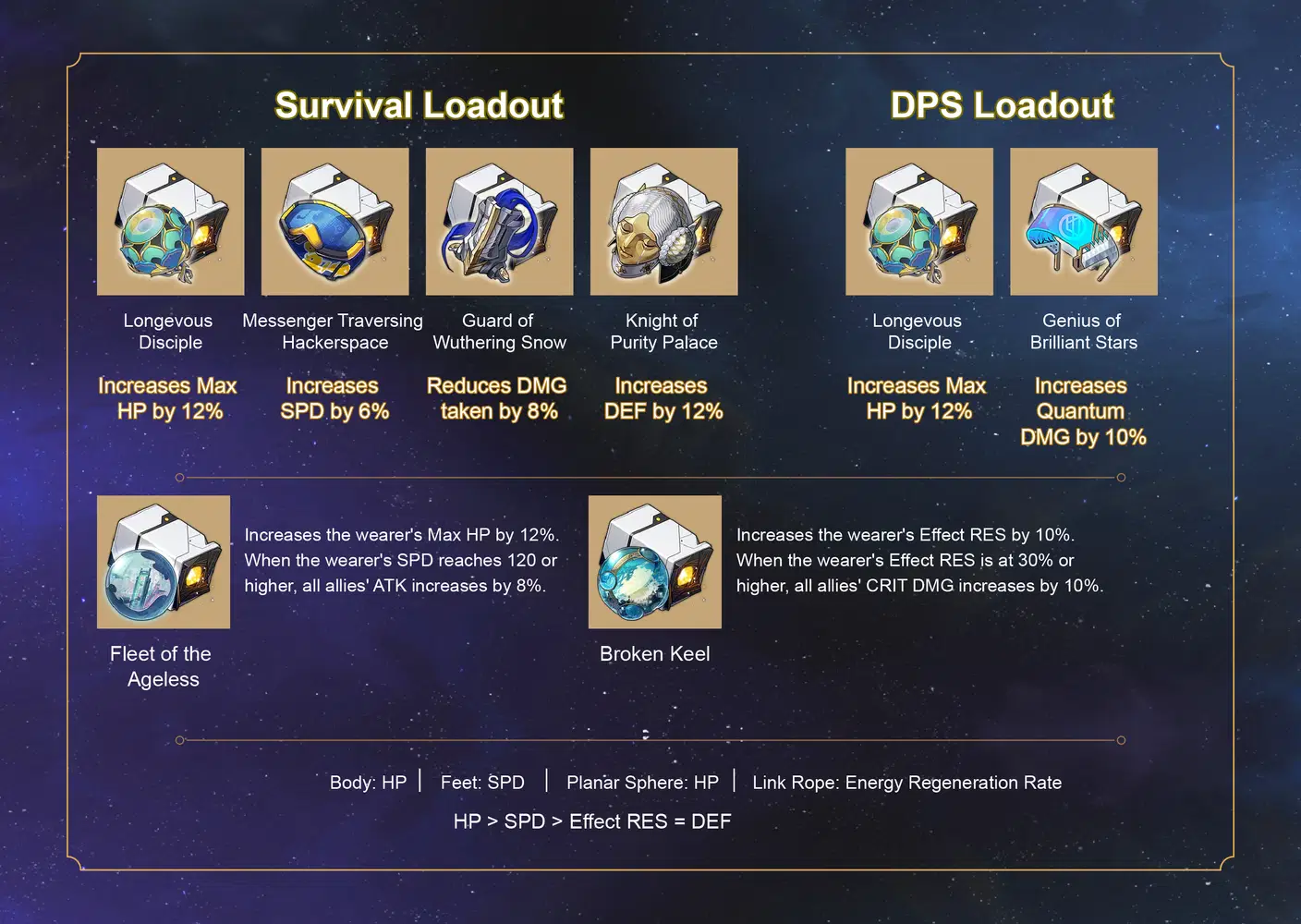 Passerby of Wandering Cloud: Fu Xuan has decent healing and she can already almost fully heal herself with her Talent. With Passerby of Wandering Cloud, she’ll be able to fully heal herself. However, the actual benefit of doing so isn’t as good as having more DMG mitigation and DEF on her. Increasing Fu Xuan’s Outgoing Healing will not boost the healing on allies from her Bonus Ability either, so this set is considered mathematically good, but not very useful in actual combat.