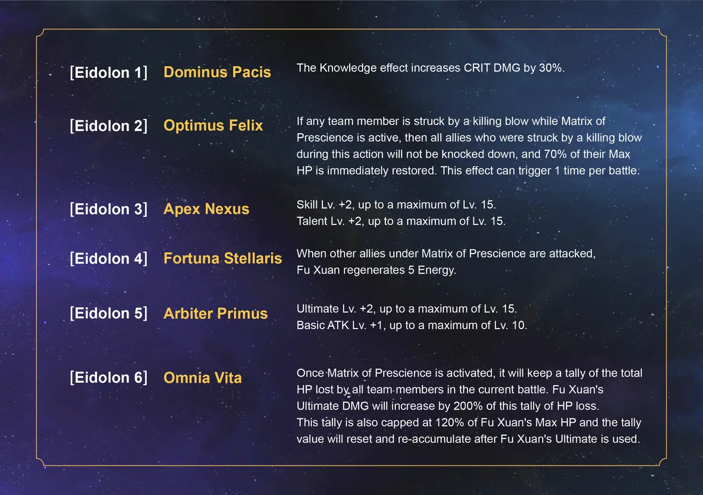 E6: Maximizes Fu Xuan’s DPS, turning Fu Xuan into more than just a survival support. If you pair E6 Fu Xuan with Blade, you can get absolutely insane multipliers on Fu Xuan’s Ultimate. This is an Eidolon reserved for whales that want to try something fun.