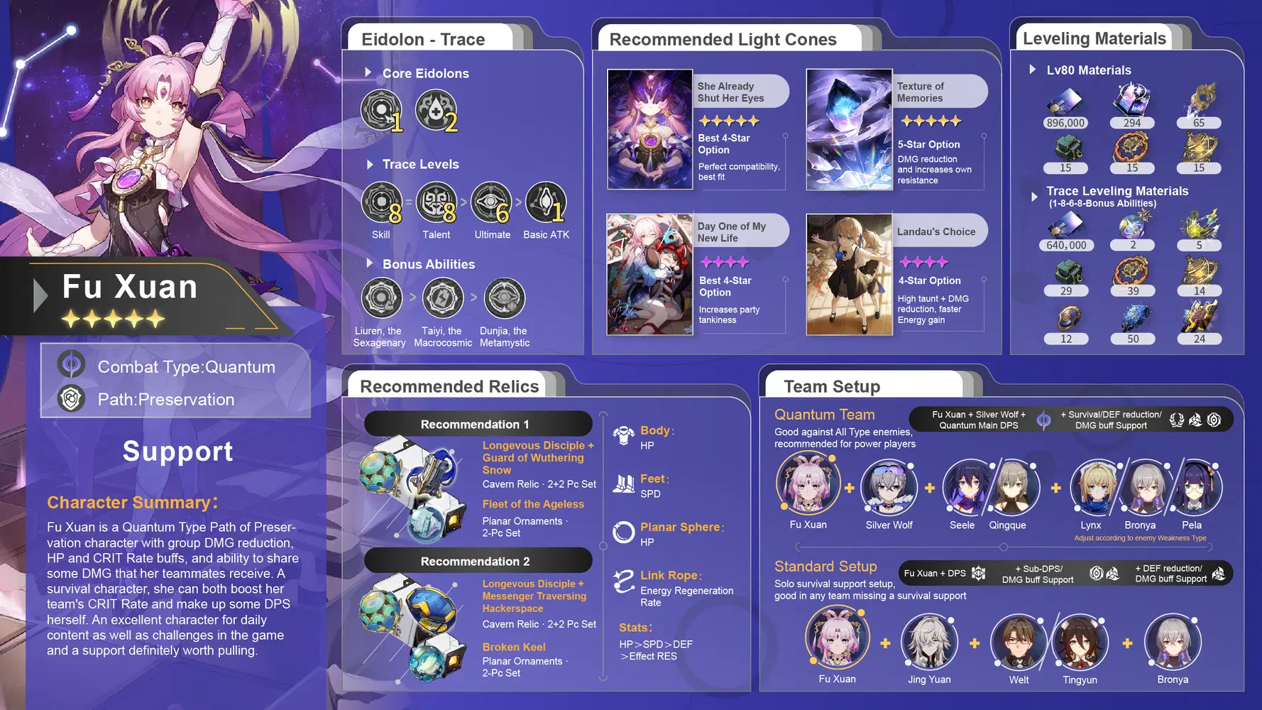 Hey there Trailblazers~ They say that Fu Xuan is one of the best survival support characters, but why exactly it that? How does one go about building her? In the following guide, I’ll be evaluating the character from her mechanics, loadouts, and team setup~ I hope this will help you understand her better!![]()