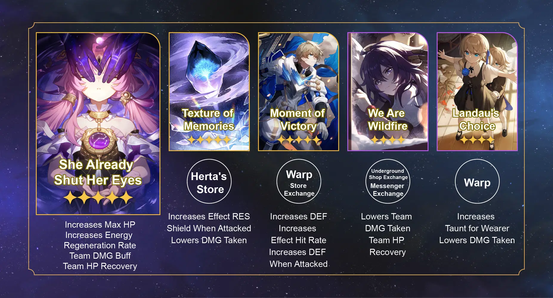 - Moment of Victory: Gives Fu Xuan a high DEF boost. The Distribution mechanic requires Fu Xuan to have high enough DEF to keep herself alive, so the DEF boost on this Light Cone is also highly useful to Fu Xuan.