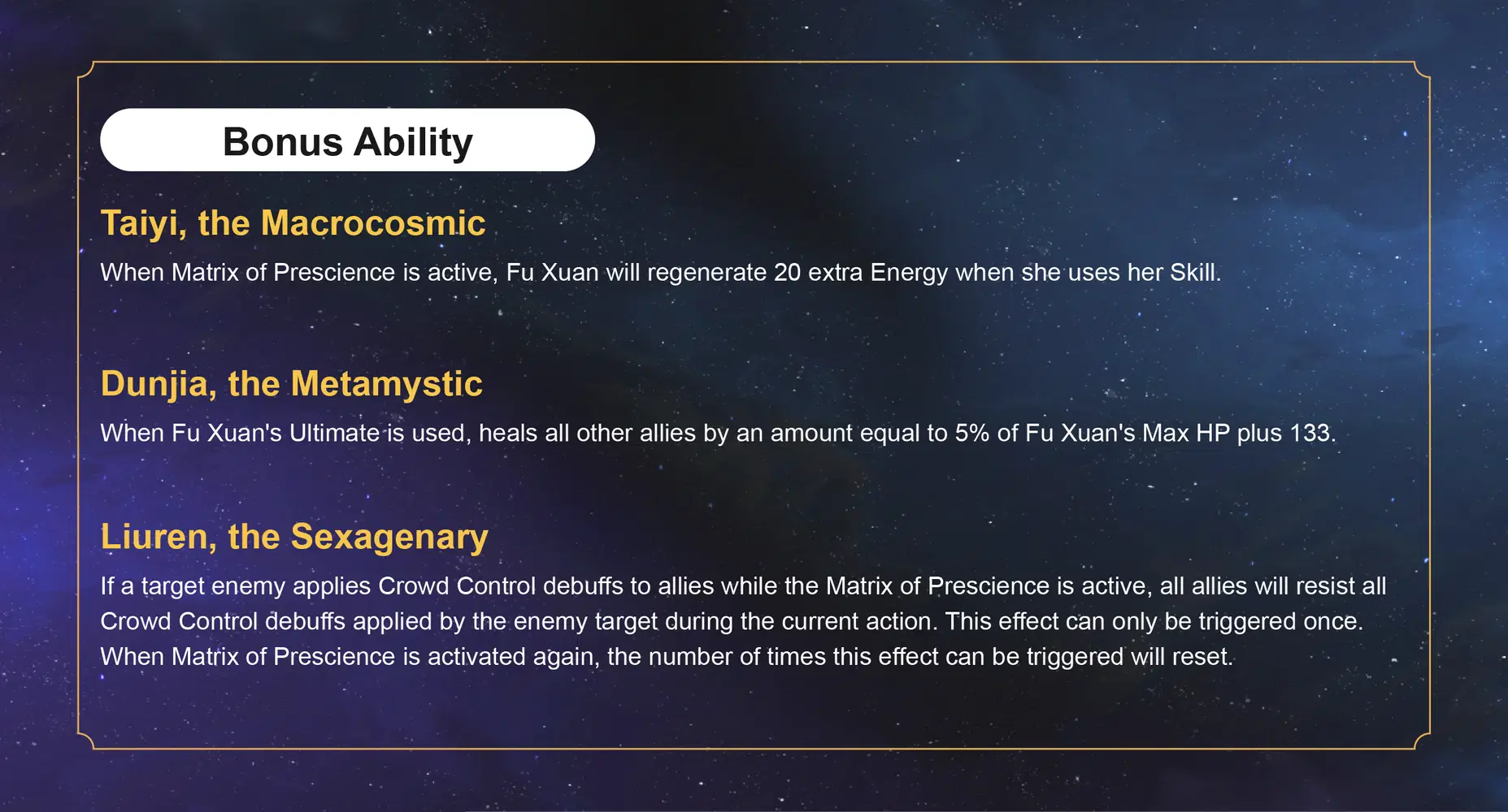 You can cast her Skill again when the Skill is active for extra Energy. This gives her perfect Matrix of Prescience uptime. The Energy Regeneration from this Trace will help Fu Xuan cast her Ultimate more frequently. In desperate scenarios, you can even chain cast her Skill for quick Energy Regeneration.